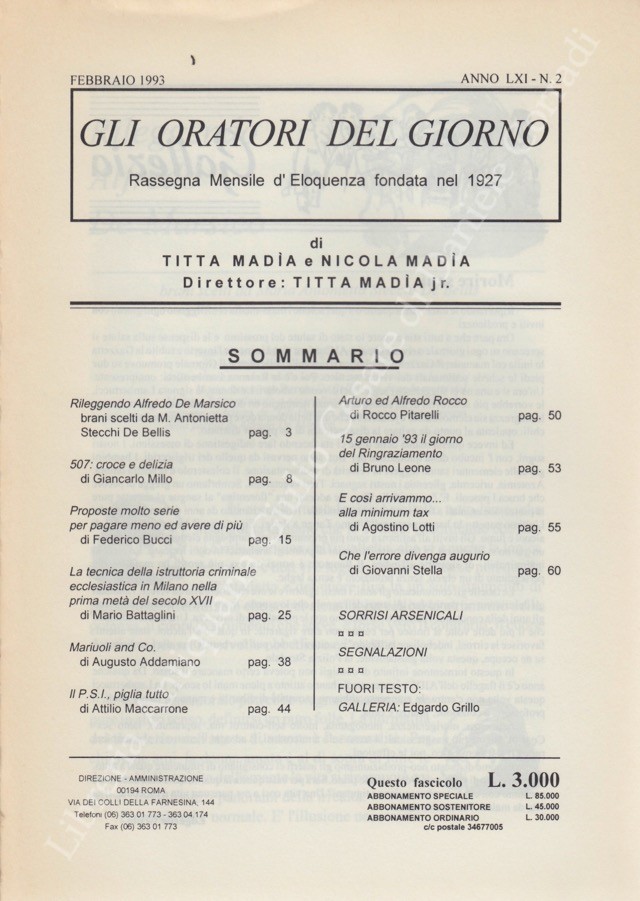Gli oratori del giorno. Rassegna mensile d'eloquenza. Anno LXI - Numero 2. Febbraio 1993