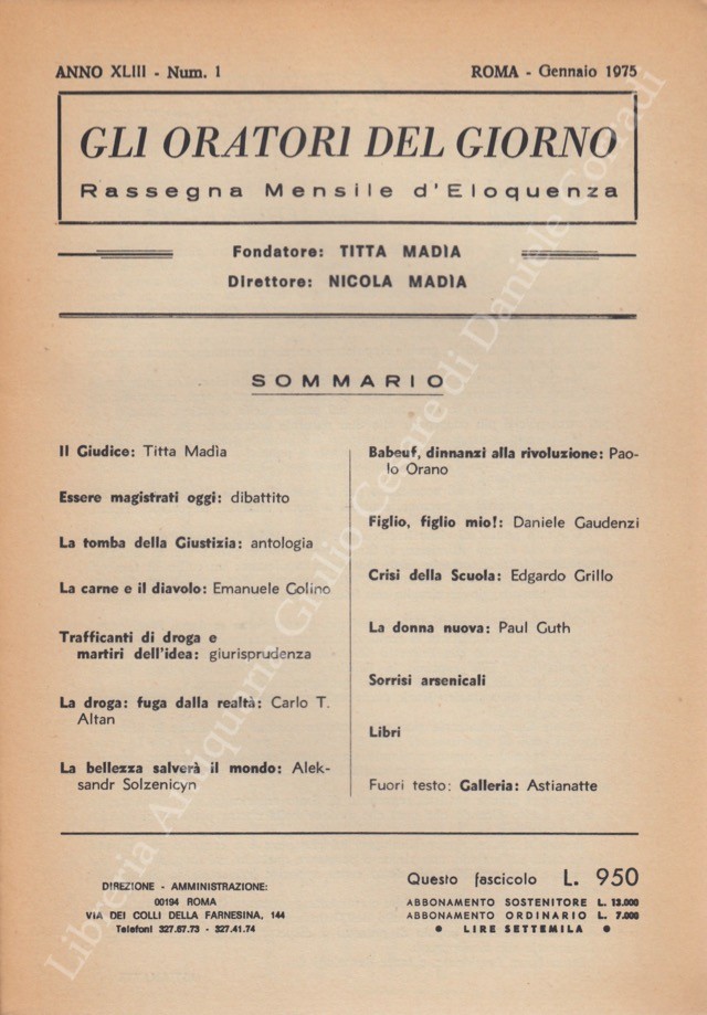 Gli oratori del giorno. Rassegna mensile d’eloquenza. Anno XLIII – Numero 1. Gennaio 1975
