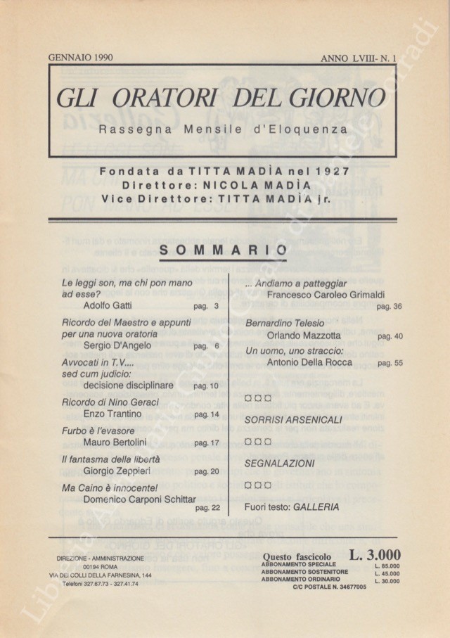 Gli oratori del giorno. Rassegna mensile d'eloquenza. Anno LVIII - Numero 1. Gennaio 1990