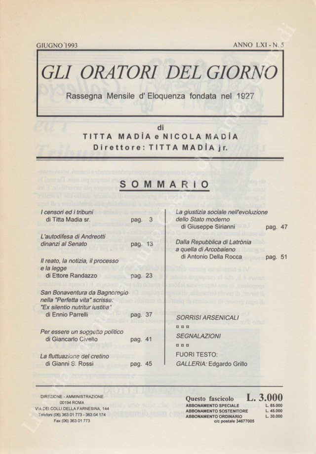 Gli oratori del giorno. Rassegna mensile d’eloquenza. Anno LXI – Numero 5. Giugno 1993