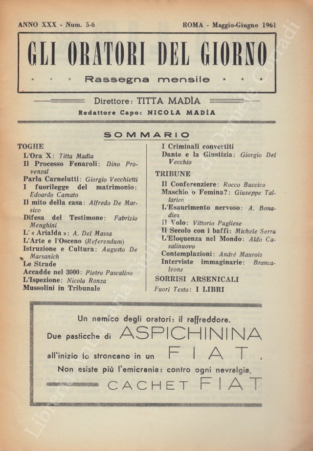 Gli oratori del giorno. Rassegna mensile d'eloquenza. Anno XXX - Numero 5-6. Maggio-Giugno 1961