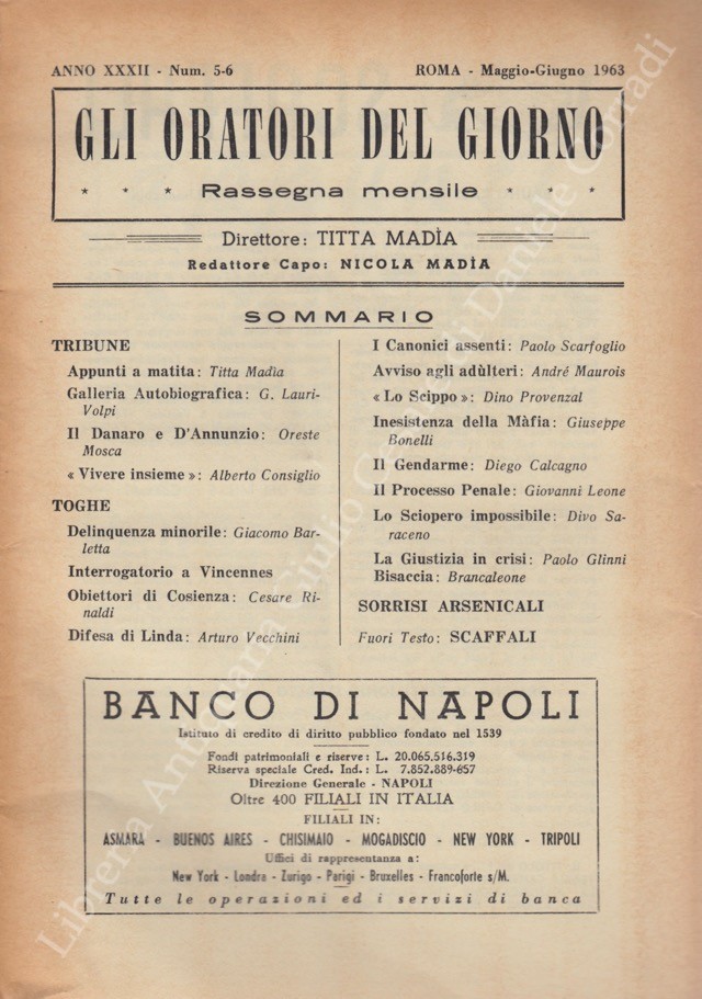Gli oratori del giorno. Rassegna mensile d'eloquenza. Anno XXXII - Numero 5-6. Maggio-Giugno 1963
