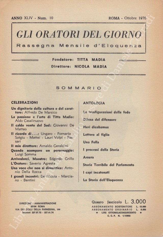 Gli oratori del giorno. Rassegna mensile d'eloquenza. Anno XLIV - Numero 10. Ottobre 1976