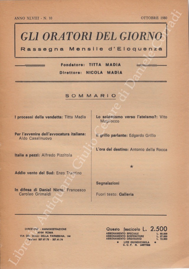 Gli oratori del giorno. Rassegna mensile d'eloquenza. Anno XLVIII - Numero 10. Ottobre 1980