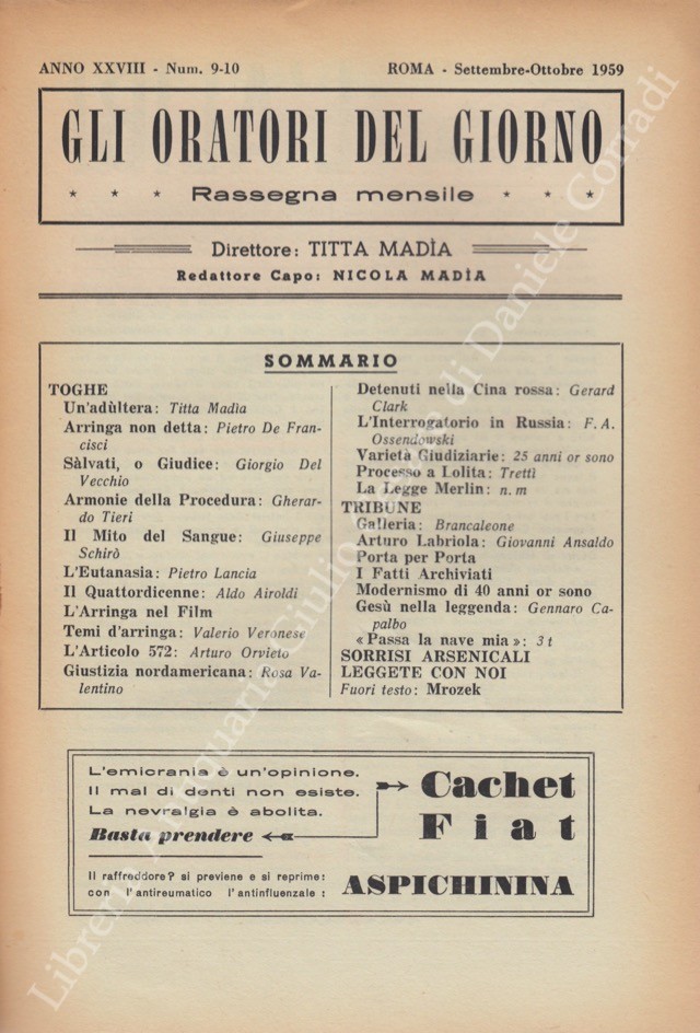 Gli oratori del giorno. Rassegna mensile d'eloquenza. Anno XXVIII - Numero 9-10. Settembre-Ottobre 1959