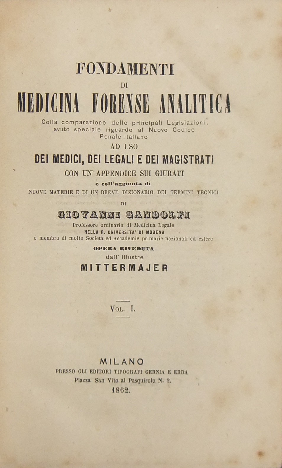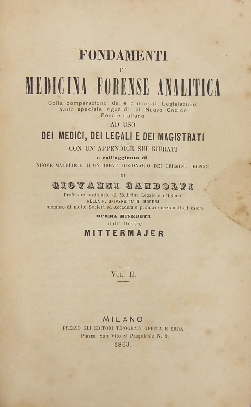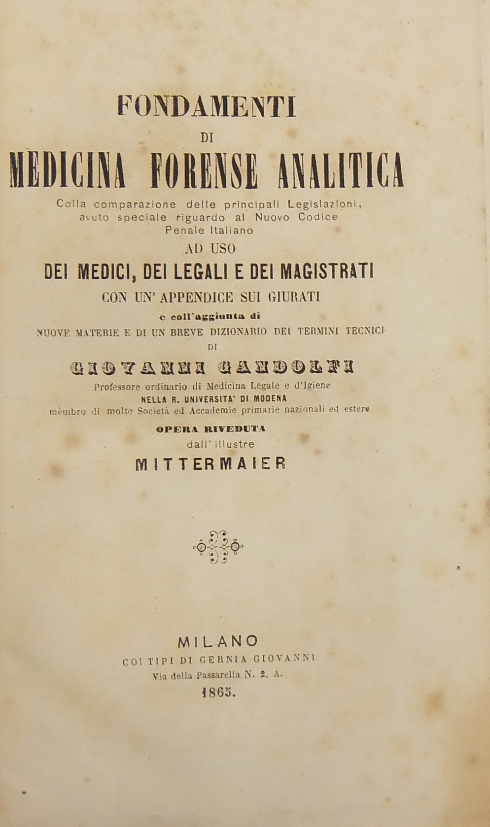 Fondamenti di medicina forense analitica colla comparazione delle principali Legislazioni, avuto speciale riguardo al Nuovo Codice Penale Italiano... Opera riveduta dall'illustre Mittermajer