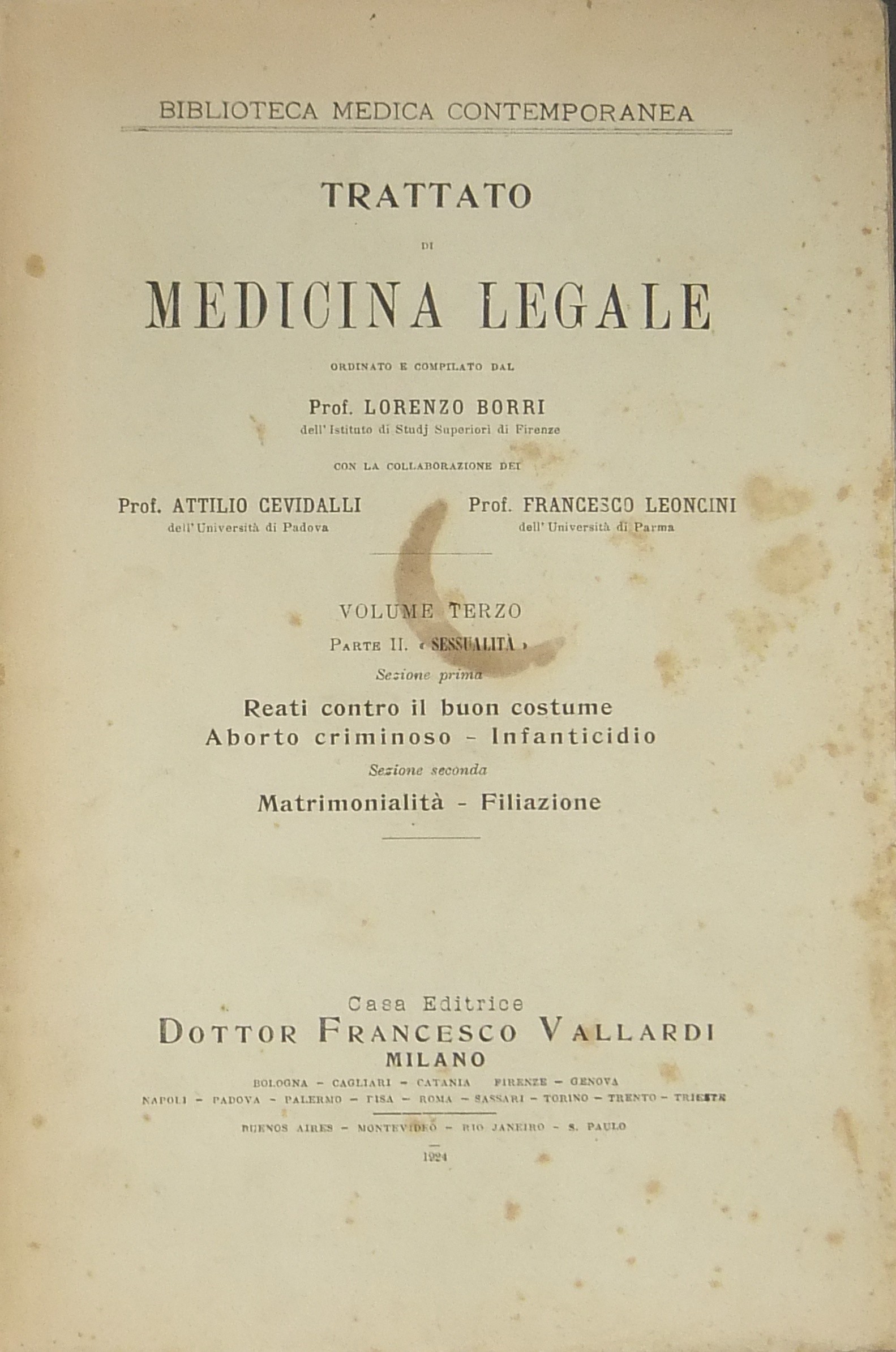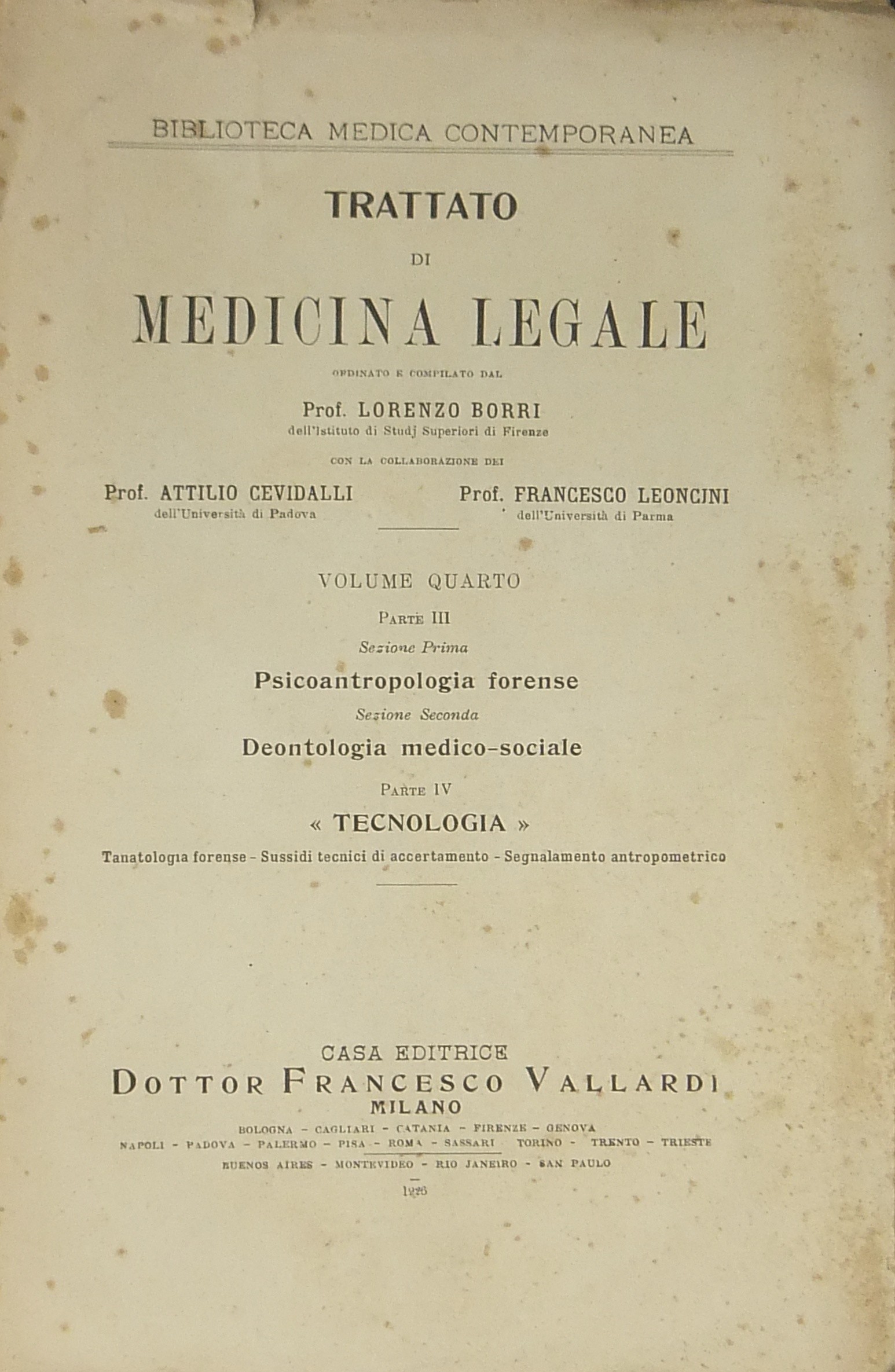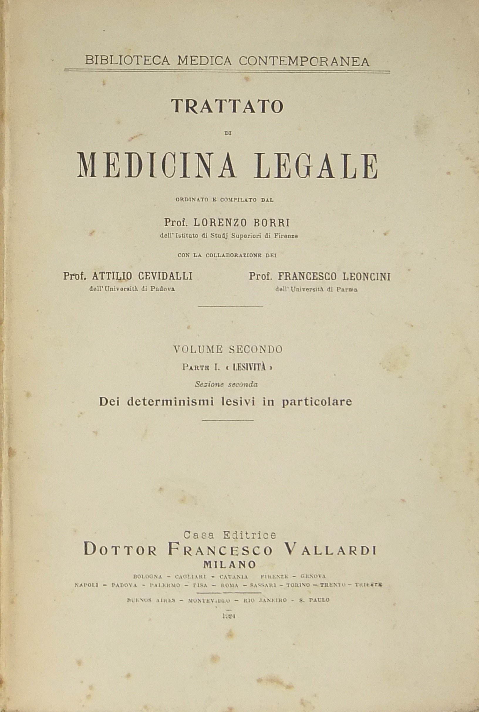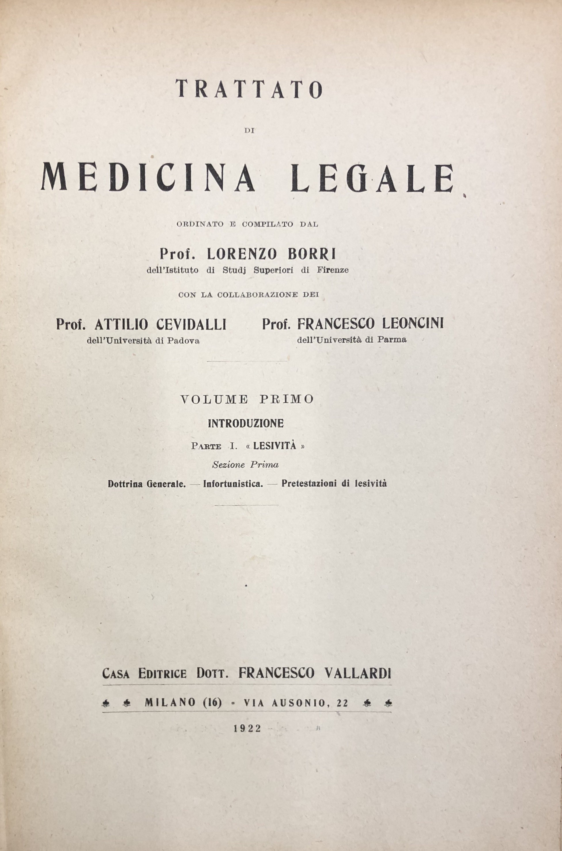 Trattato di medicina legale ordinato e compilato dal prof. Lorenzo Borri con la collaborazione dei prof. Attilio Cevidalli e Francesco Leoncini. Vol. I - Introduzione, Parte I - Lesività . Sezione prima - Dottrina generale. Infortunistica. Prestazioni di lesività . Vol. II, Parte I - Lesività . Sezione seconda - Dei determinismi lesivi in particolare. (Sommario sul frontespizio). Vol. III, Parte II - Sessualità . Sezione prima. Reati contro il buon costume. Aborto criminoso. Infanticidio. Sezione seconda. Matrimonialita. Filiazione. (Sommario sul frontespizio). Vol. IV, Parte III - Sezione prima. Psicoantropologia forense. Sezione seconda Deontologia medico sociale. Parte IV - Tecnologia. Tanatologia forense. Sussidi tecnici di accertamento. Segnalamento antropometrico