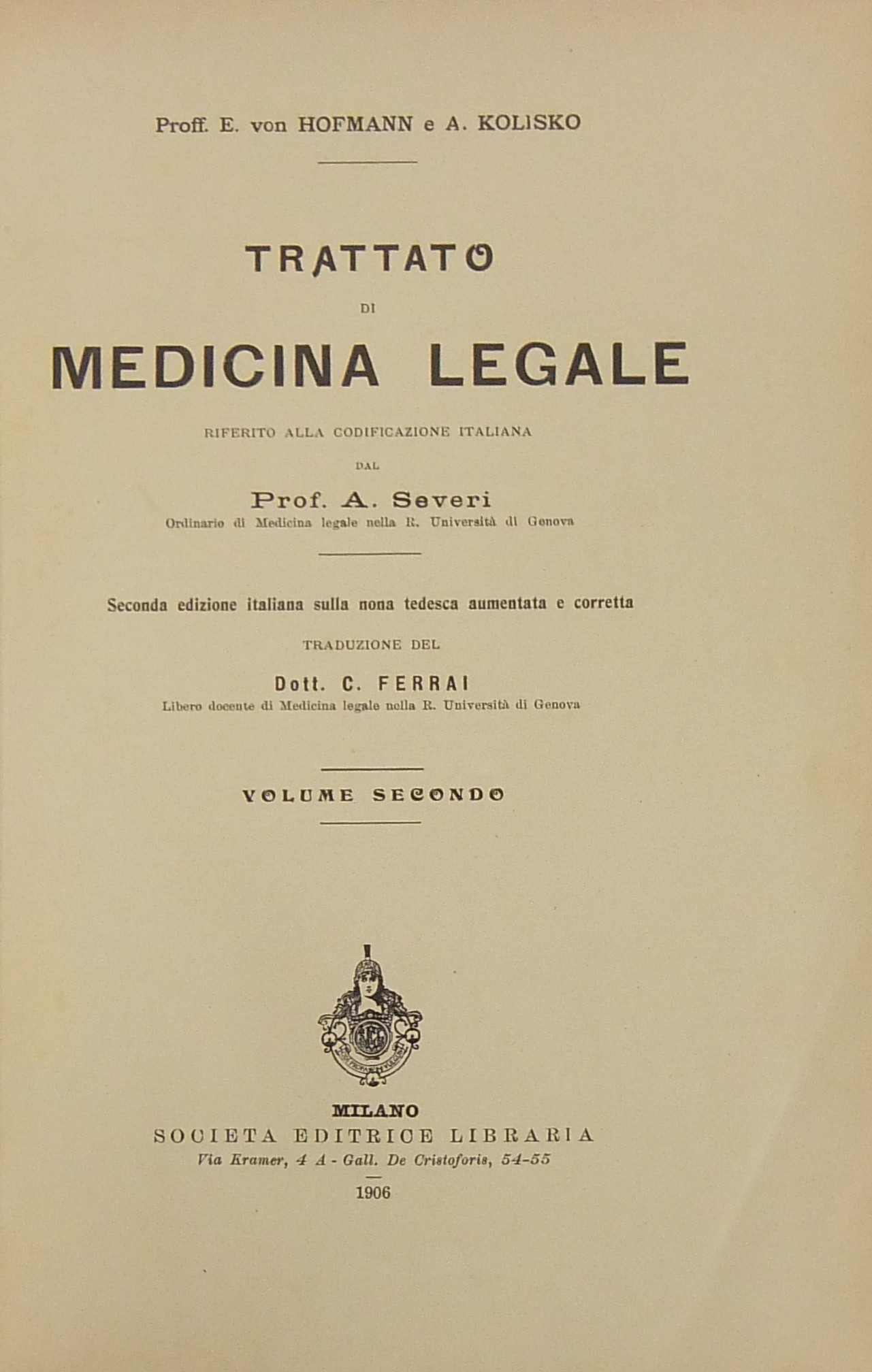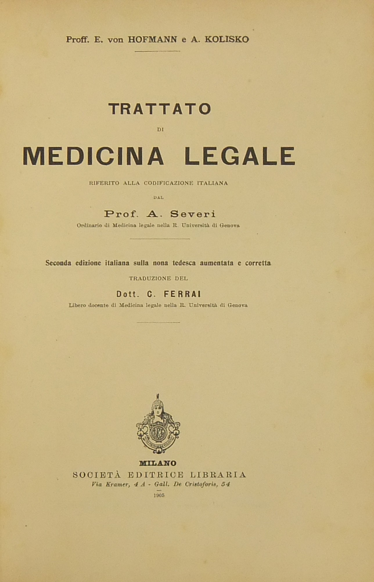 Trattato di medicina legale. Riferito alla codificazione italiana dal Prof. A. Severi. Traduzione del Dott. C. Ferrai.