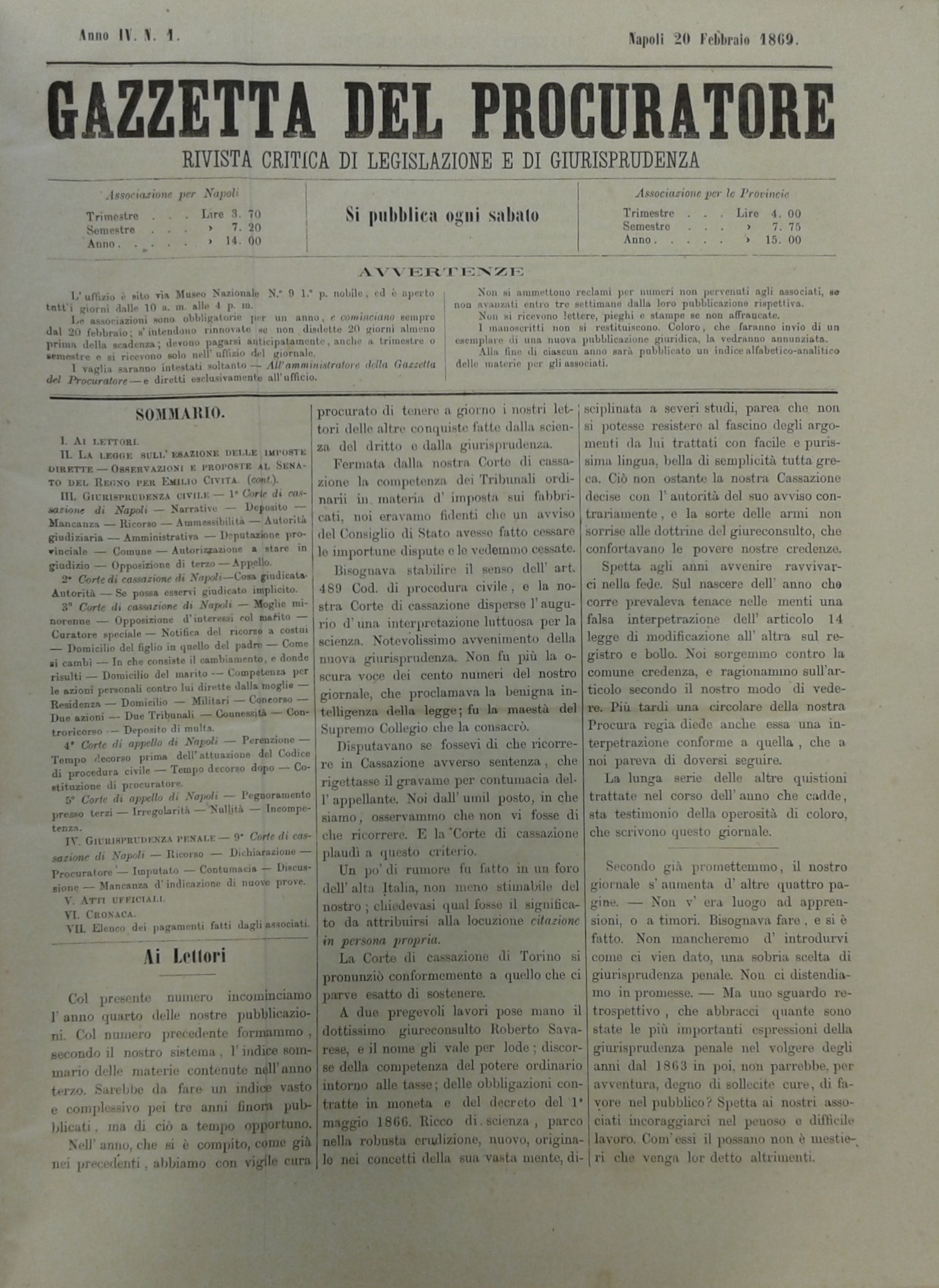 Gazzetta del Procuratore. Rivista critica di legislazione e di giurisprudenza. Diretta da Alessandro delli Paoli e Giovanni Battista di Lorenzo. Anno IV - 1869-70