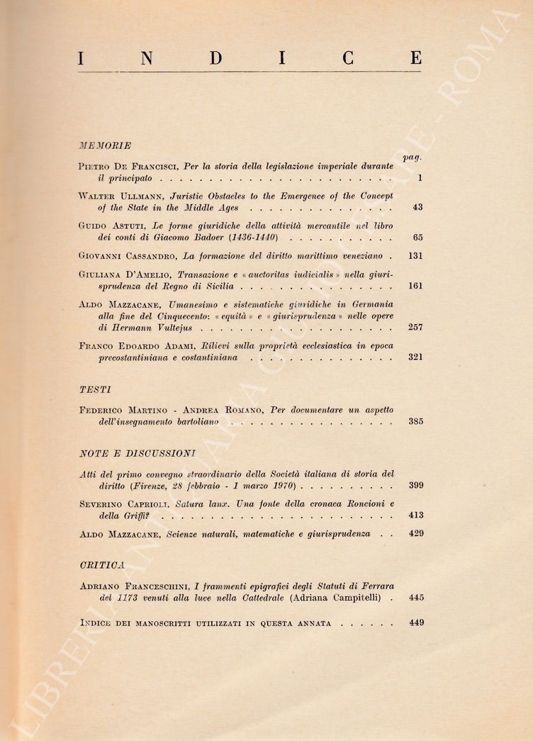 Scritti di: Adami, Astuti, Cassandro, D'Amelio G., De Francisci, Franceschini, Martino, Mazzacane, Romano Andrea, Ullmann