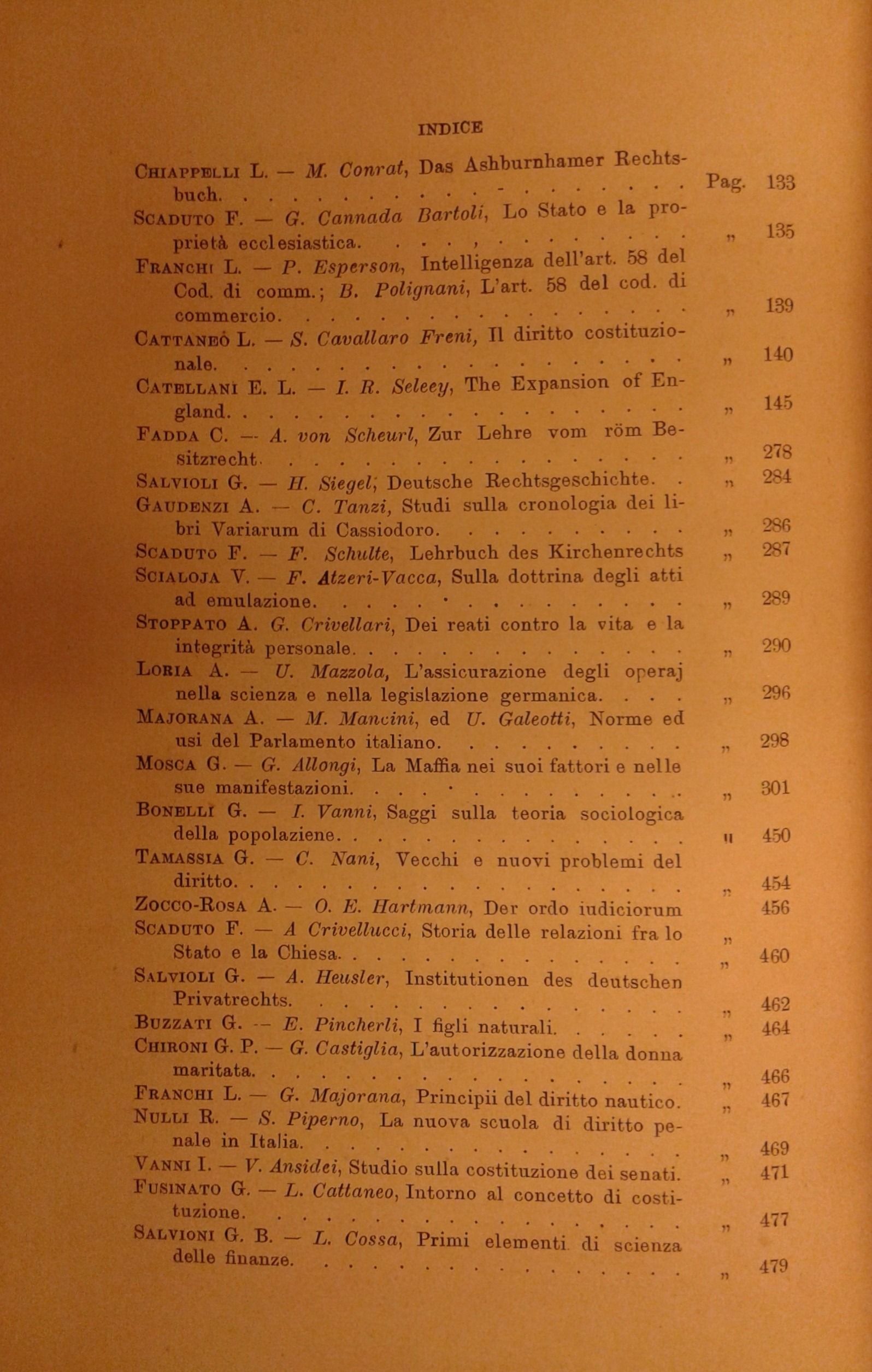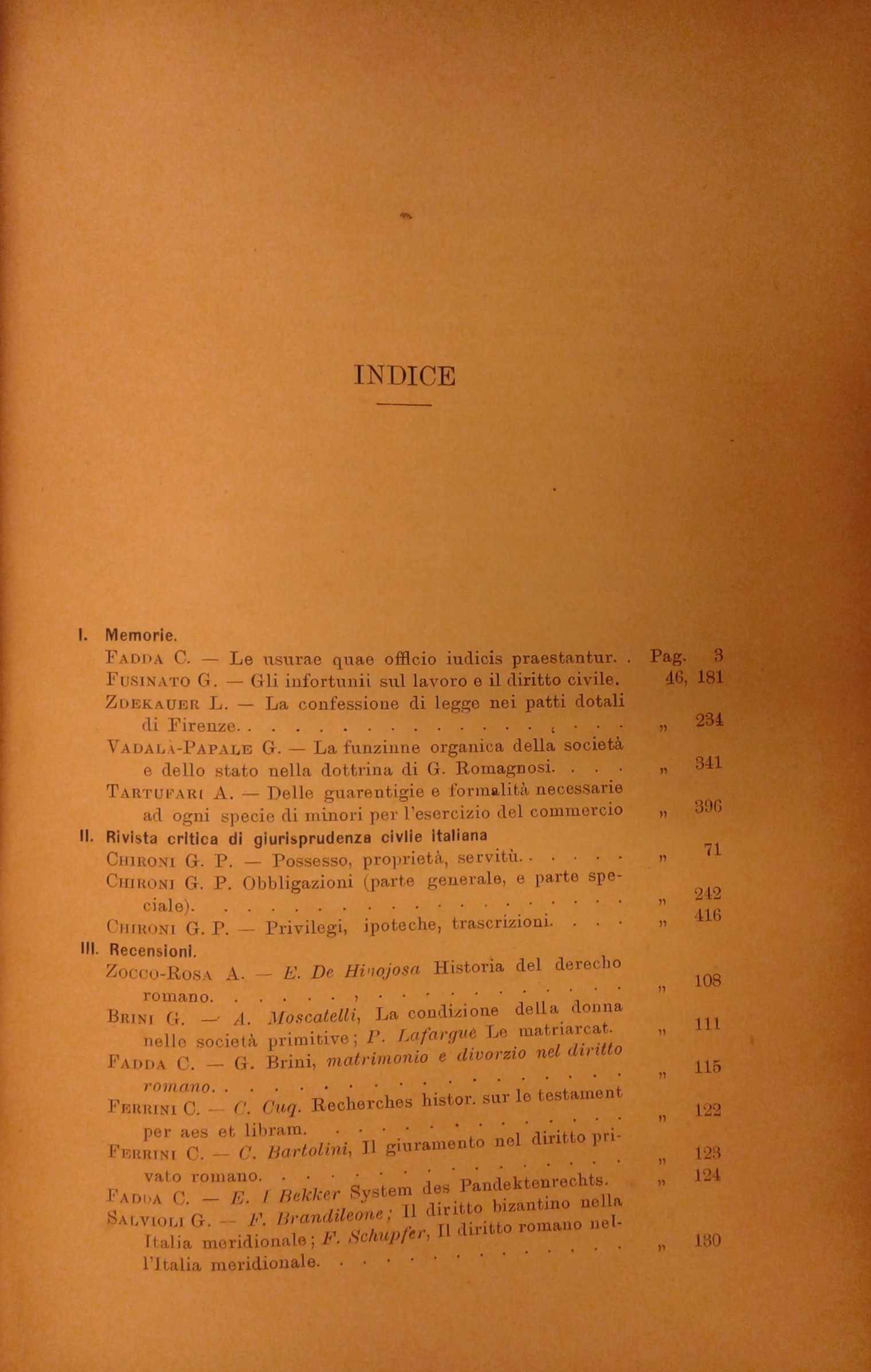 La rivista fu fondata nel 1877 da F.Schupfer e G.Fusinato. Diretta successivamente da Filippo Vassalli e Francesco Calasso e pubblicata da Giuffrè. Scritti di: Bonelli, Buzzati, Catellani, Cattaneo, Chiappelli, Chironi, Fadda, Ferrini, Franchi, Fusinato, Gaudenzi, Loria, Majorana, Mazzola, Mosca, Nulli, Salvioli, Salvioni, Scaduto, Scialoja, Stoppato, Tamassia, Tartufari, Vadala Papale, Vanni, Zdekauer, Zocco Rosa.