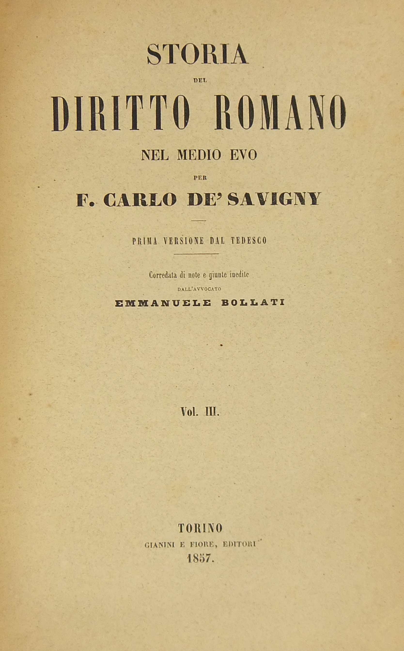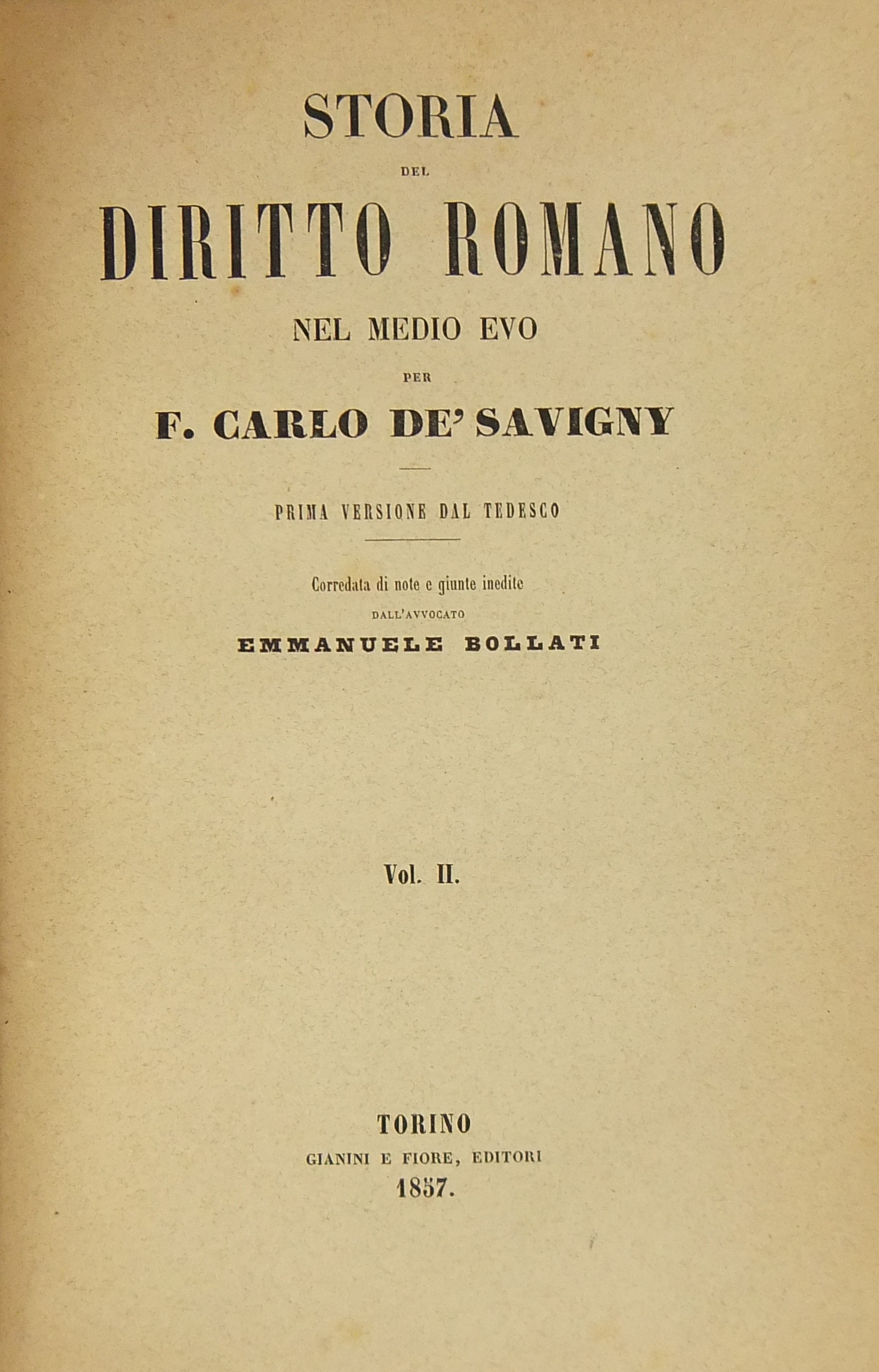 Storia del diritto romano nel Medio Evo. Prima versione dal tedesco di Emmanuele Bollati con note e giunte inedite. Appendice I - Appunti per la storia del diritto longobardo di Giovanni Merkel; Appendice II - Chiosa alle istituzioni di Giustiniano
