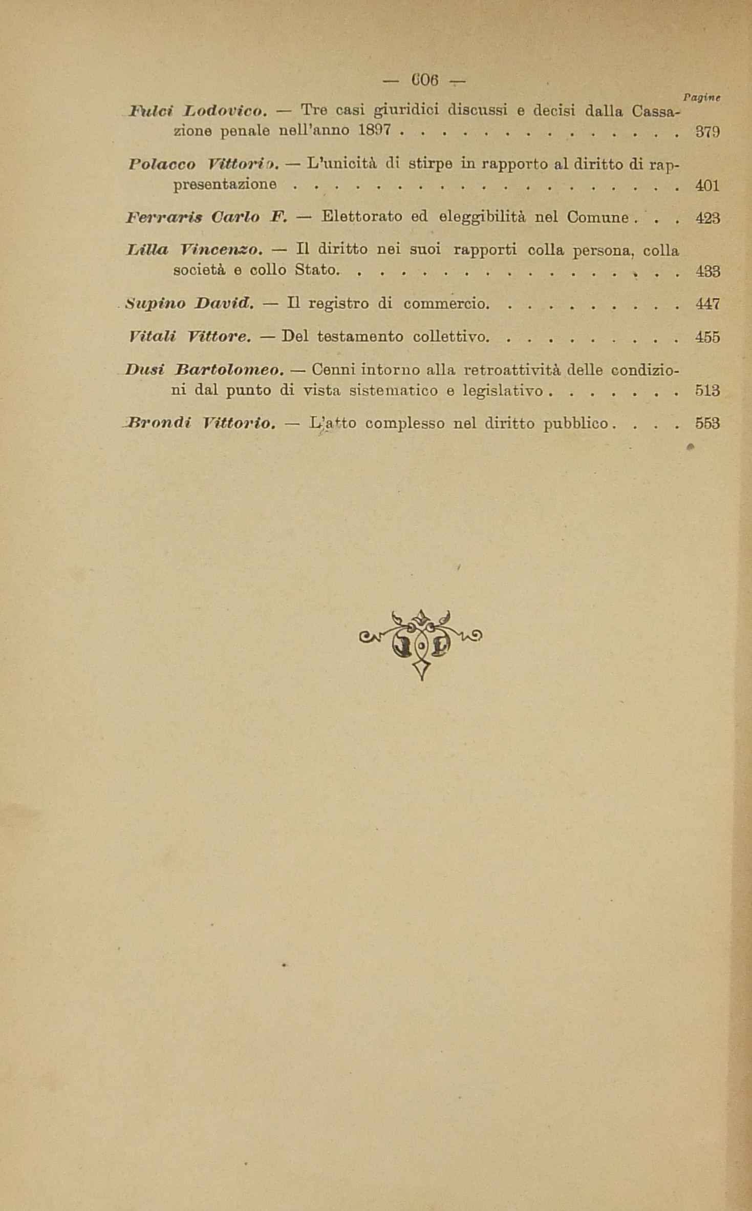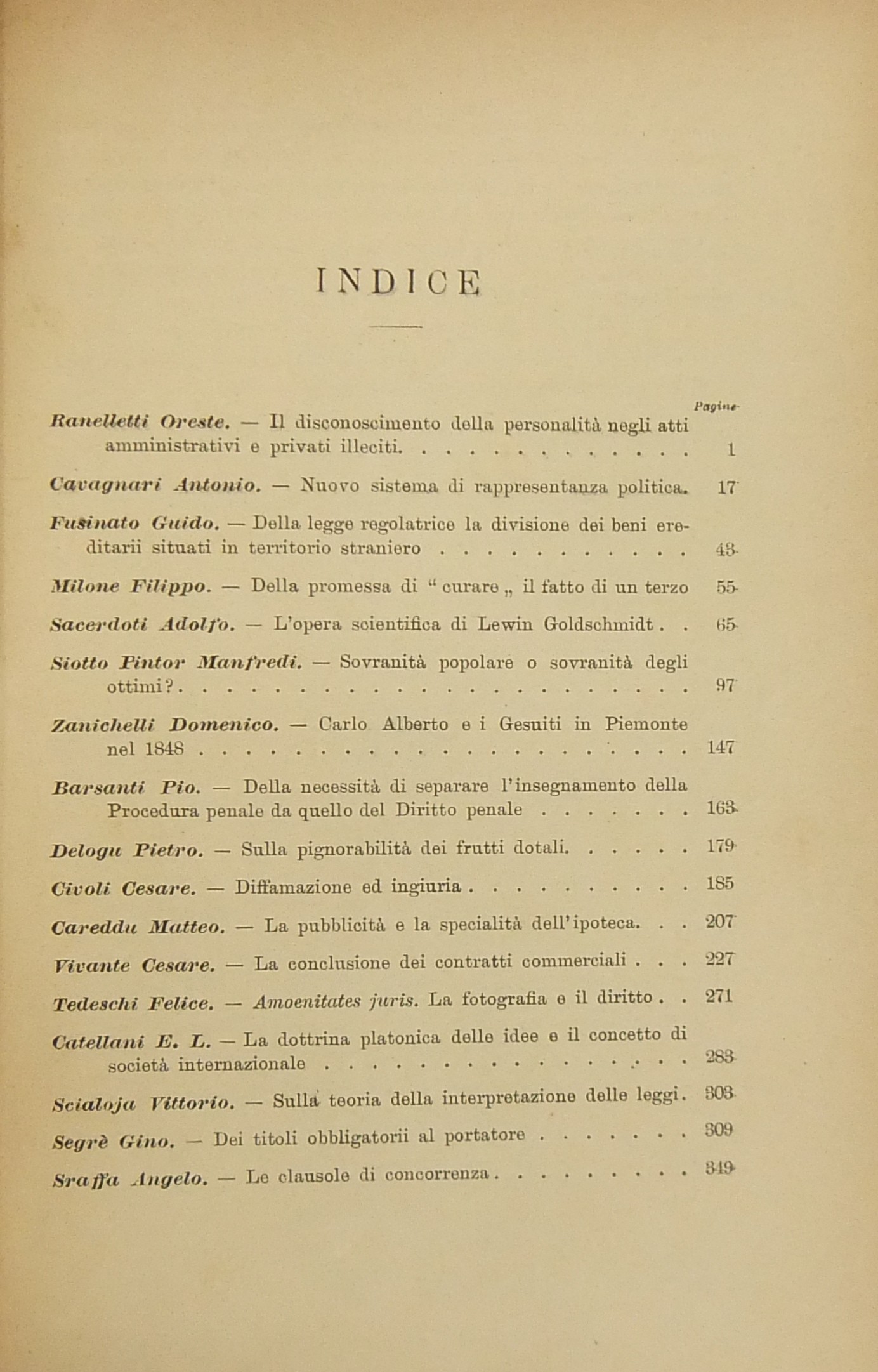 Scritti di: Barsanti; Brondi; Careddu; Catellani; Cavagnari; Civoli; Delogu; Dusi; Ferraris; Fulci; Fusinato; Lilla; Milone; V. Polacco; Ranelletti; Sacerdoti; Scialoja; G. Segrè; Siotto Pintor; Sraffa; Supino; F. Tedeschi; Vitali; Vivante; Zanichelli.