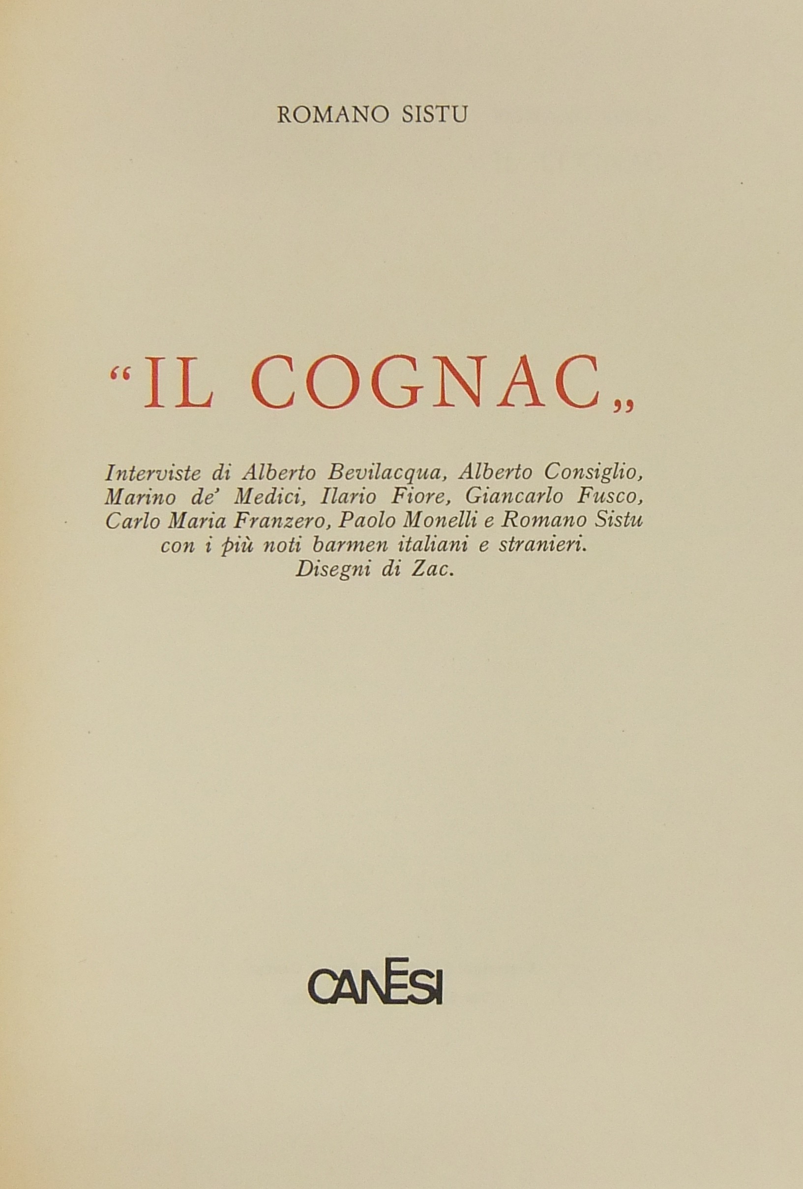 Il cognac. Interviste di: Alberto Bevilacqua, Alberto Consiglio, Marino de' Medici, Ilario Fiore, Giancarlo Fusco, Carlo M. Franzero, Paolo Monelli e Romano Sistu. Con i più noti barmen italiani e stranieri. Disegni di Zac