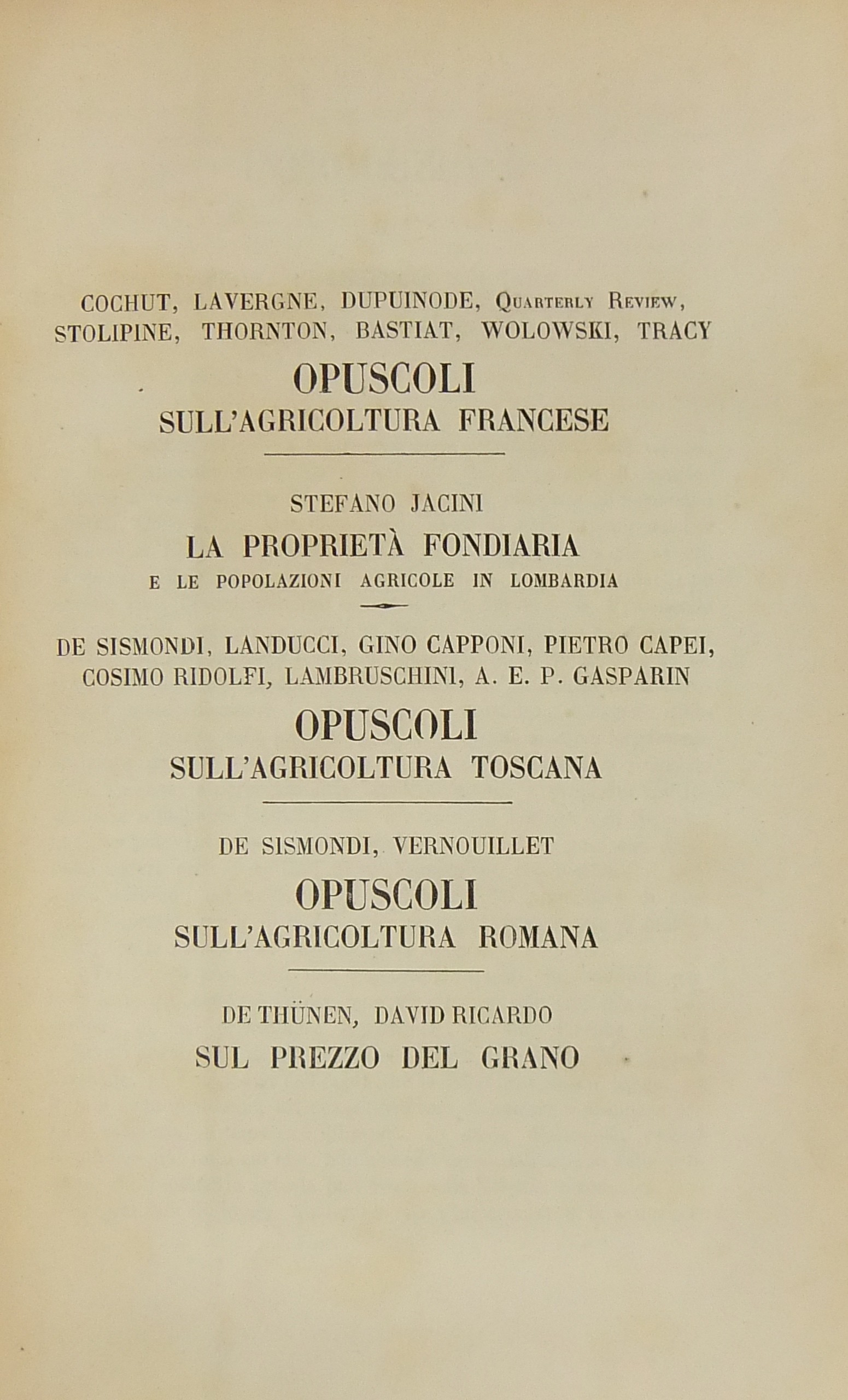 Agricoltura e quistioni economiche che la riguardano. Opuscoli sull'agricoltura francese (Cochut, Lavergne, Dupuinode, Stolipine, Thornton, Bastiat, Woloski, Tracy). La proprietà fondiaria e le popolazioni agricole in Lombardia (Jacini). Opuscoli sull'agricoltura toscana (De Sismondi, Landucci, Capponi, Capei, Ridolfi, Lambruschini, Gasparin). Opuscoli sull'agricoltura romana (De Sismondi, Vernouillet). Sul prezzo del grano (De Thunen, Ricardo). Introduzione di Francesco Ferrara