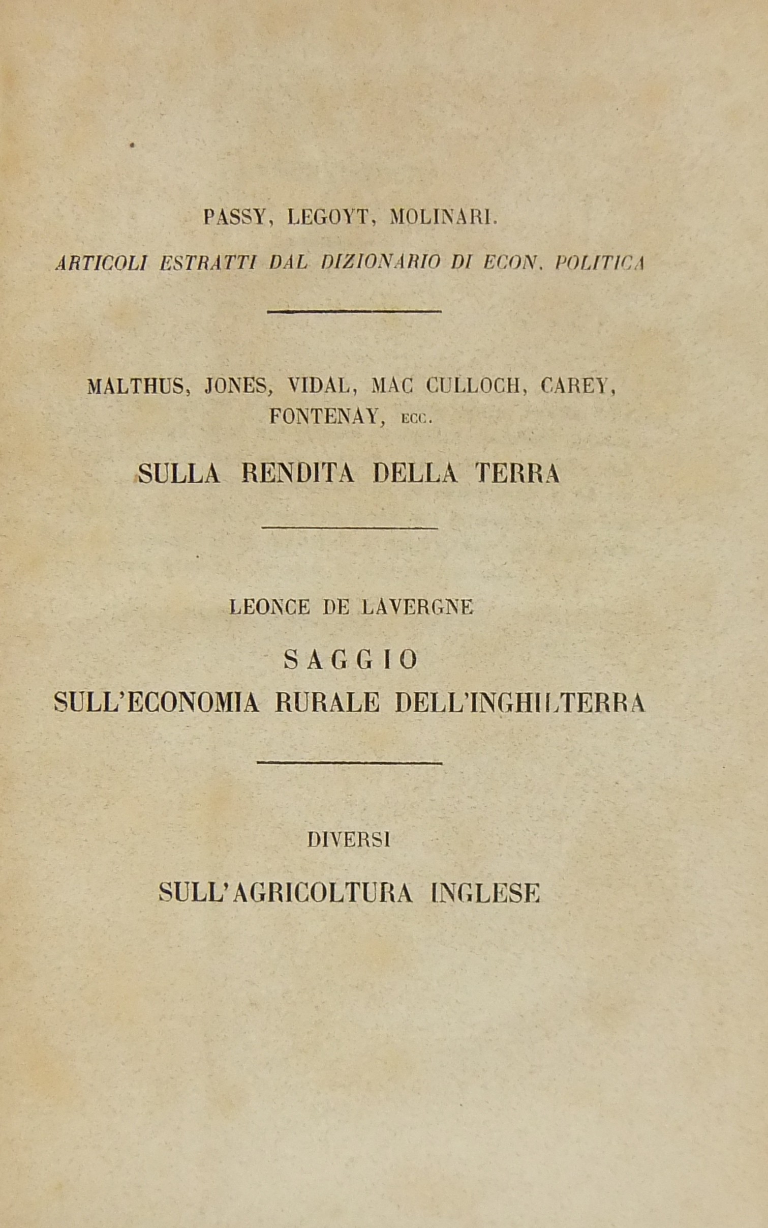 Agricoltura e quistioni economiche che la riguardano. Passy, Legoyt, Molinari - Articoli estratti dal Dizionario di economia politica. Malthus, Jones, Vidal, Mc Culloch, Carey, Fontenay ecc. - Sulla rendita della terra. Leonce de Lavergne - Saggio sull'economia rurale dell'Inghilterra. Autori Diversi - Sull'agricoltura inglese