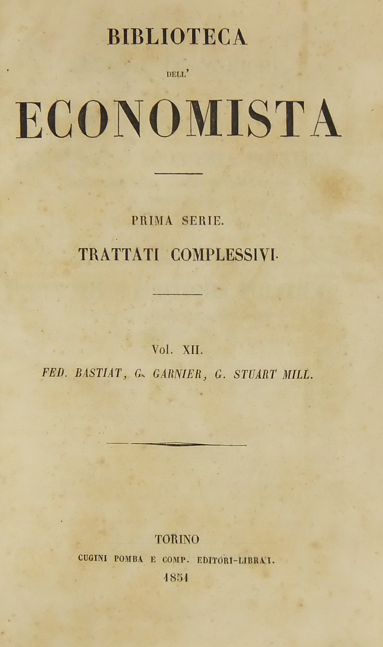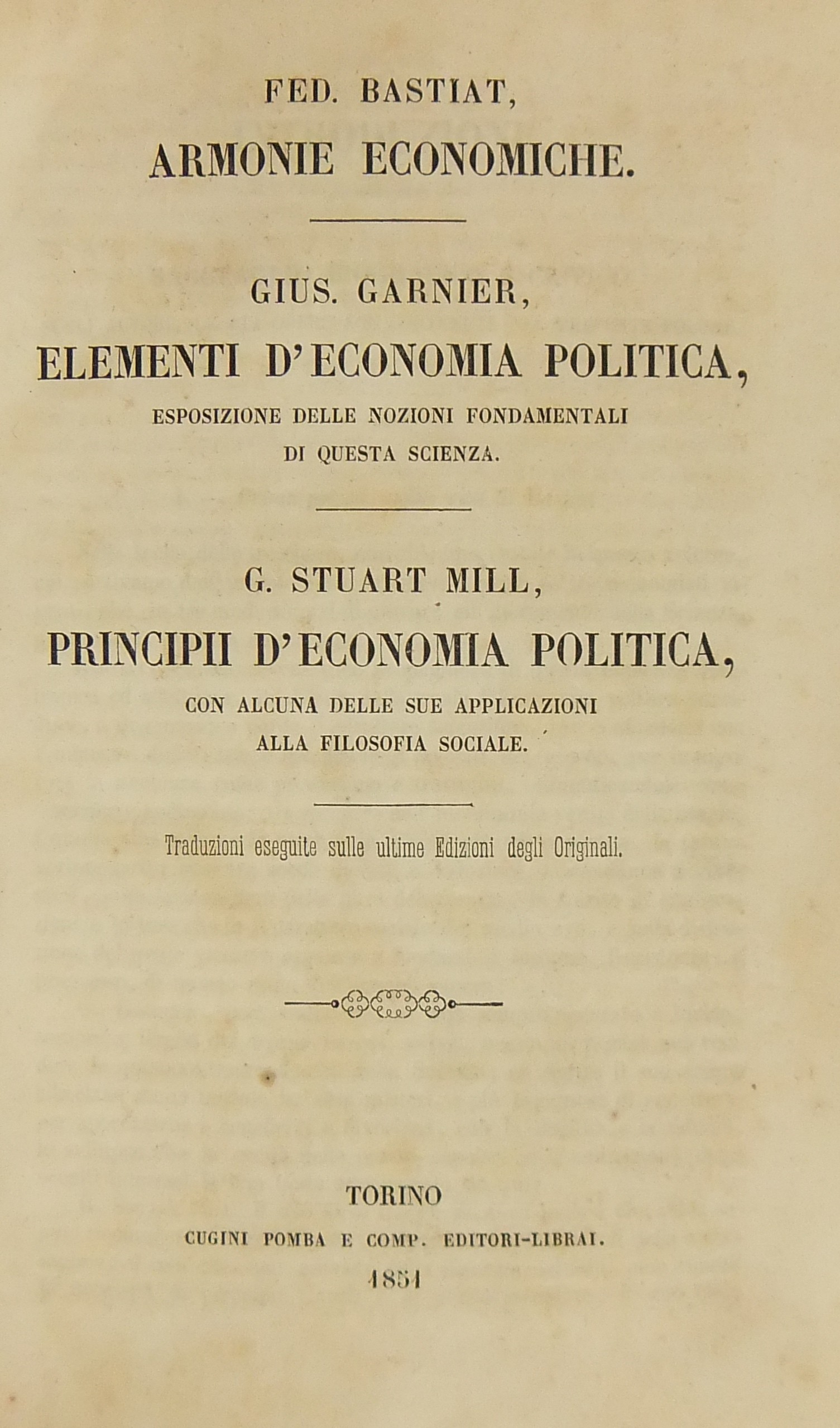 Armonie economiche (Bastiat). Elementi di economia politica esposizione delle nozioni fondamentali di questa scienza (Garnier). Principii d'economia politica con alcuna delle sue applicazioni alla filosofia sociale (Stuart Mill). Introduzione di Francesco Ferrara