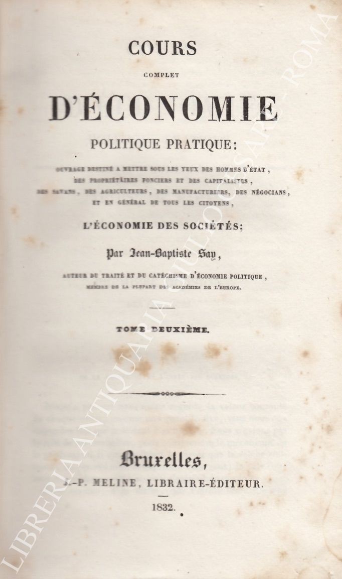 Cours complet d'economie politique pratique; ouvrage destine a mettre sous les yeux des hommes d'etat, des proprietaires fonciers et des capitalistes, des savans, des agriculteurs, des manufacturiers, des negocians, et en general de tous les citoyens, l'economie des societes