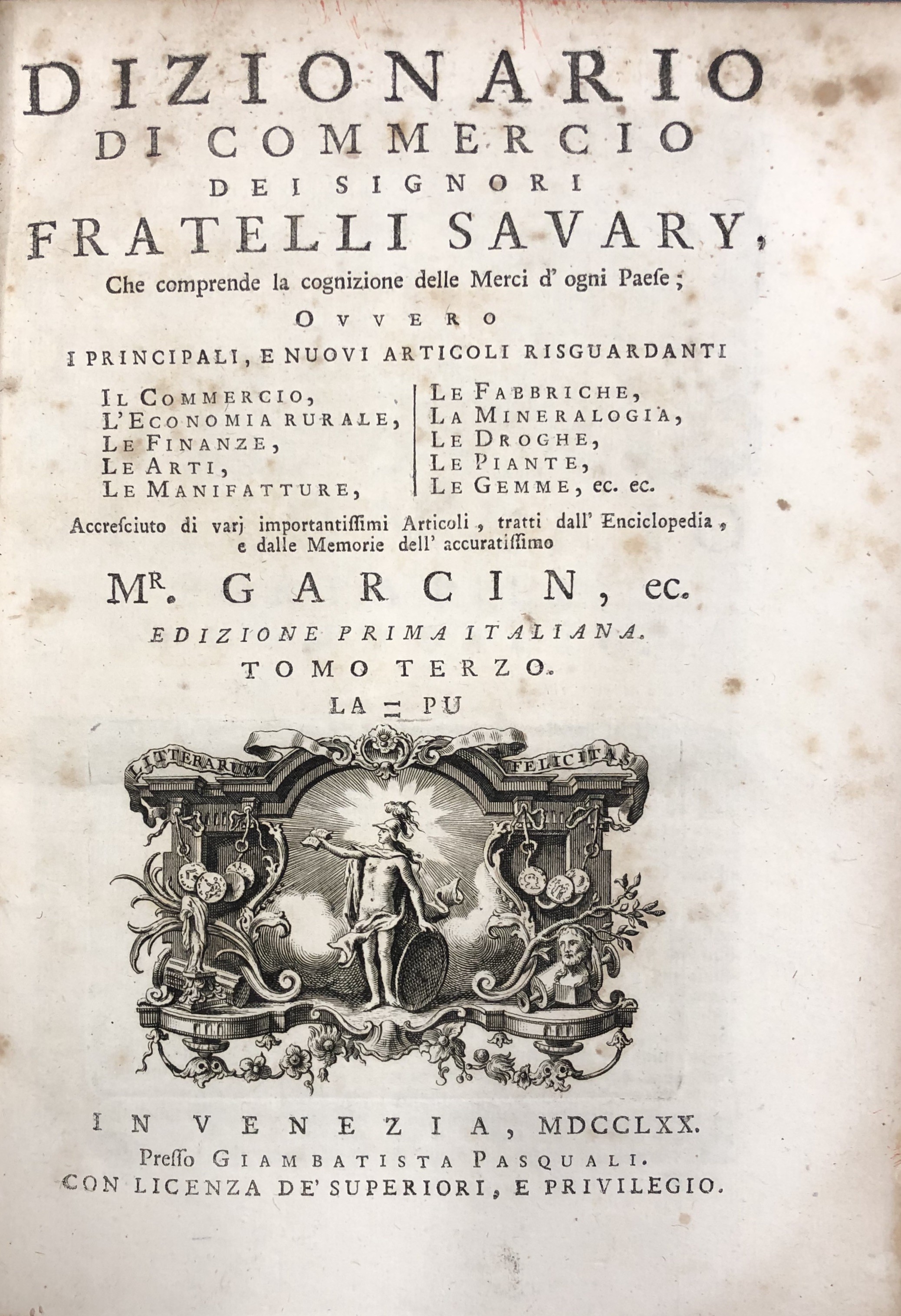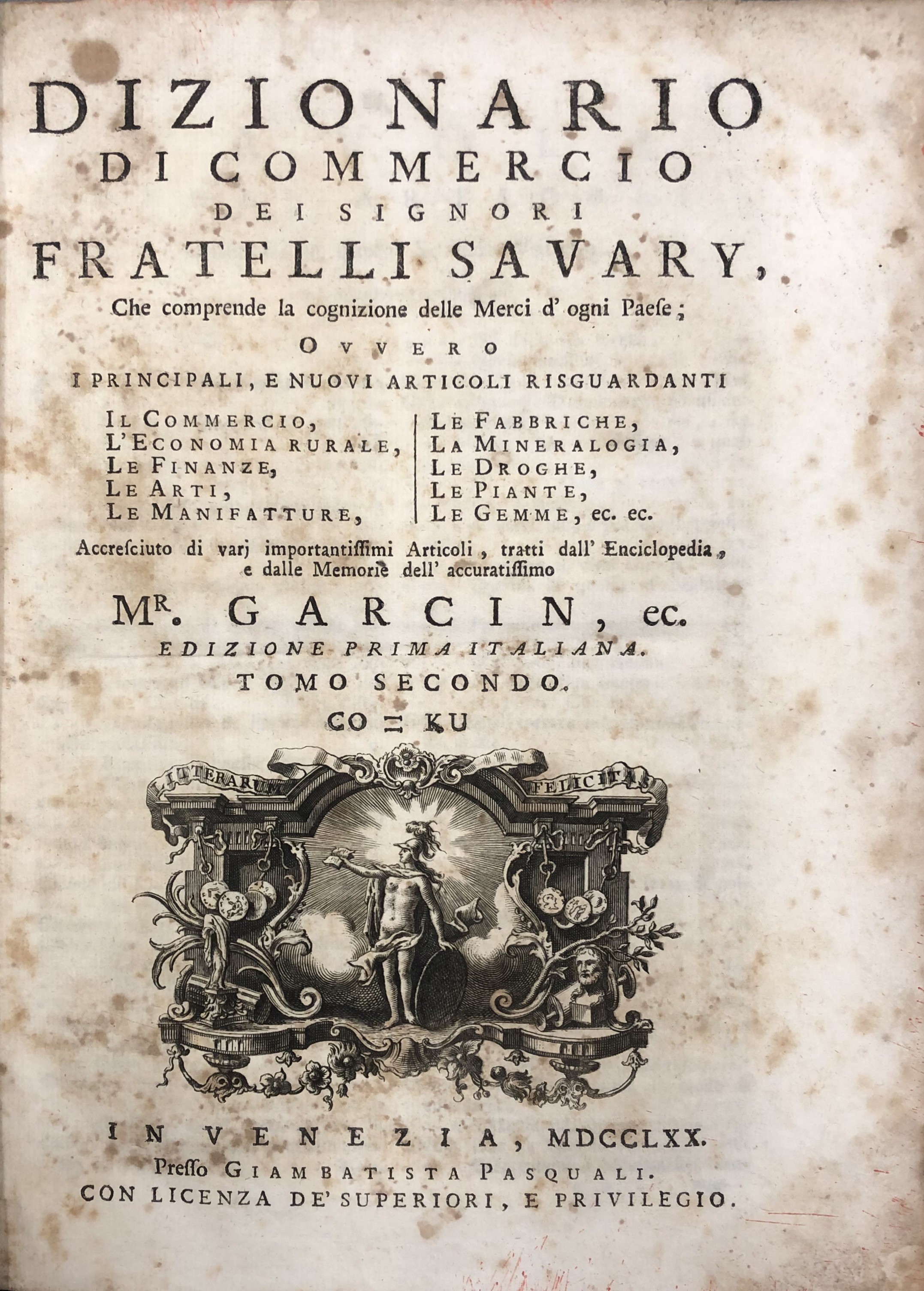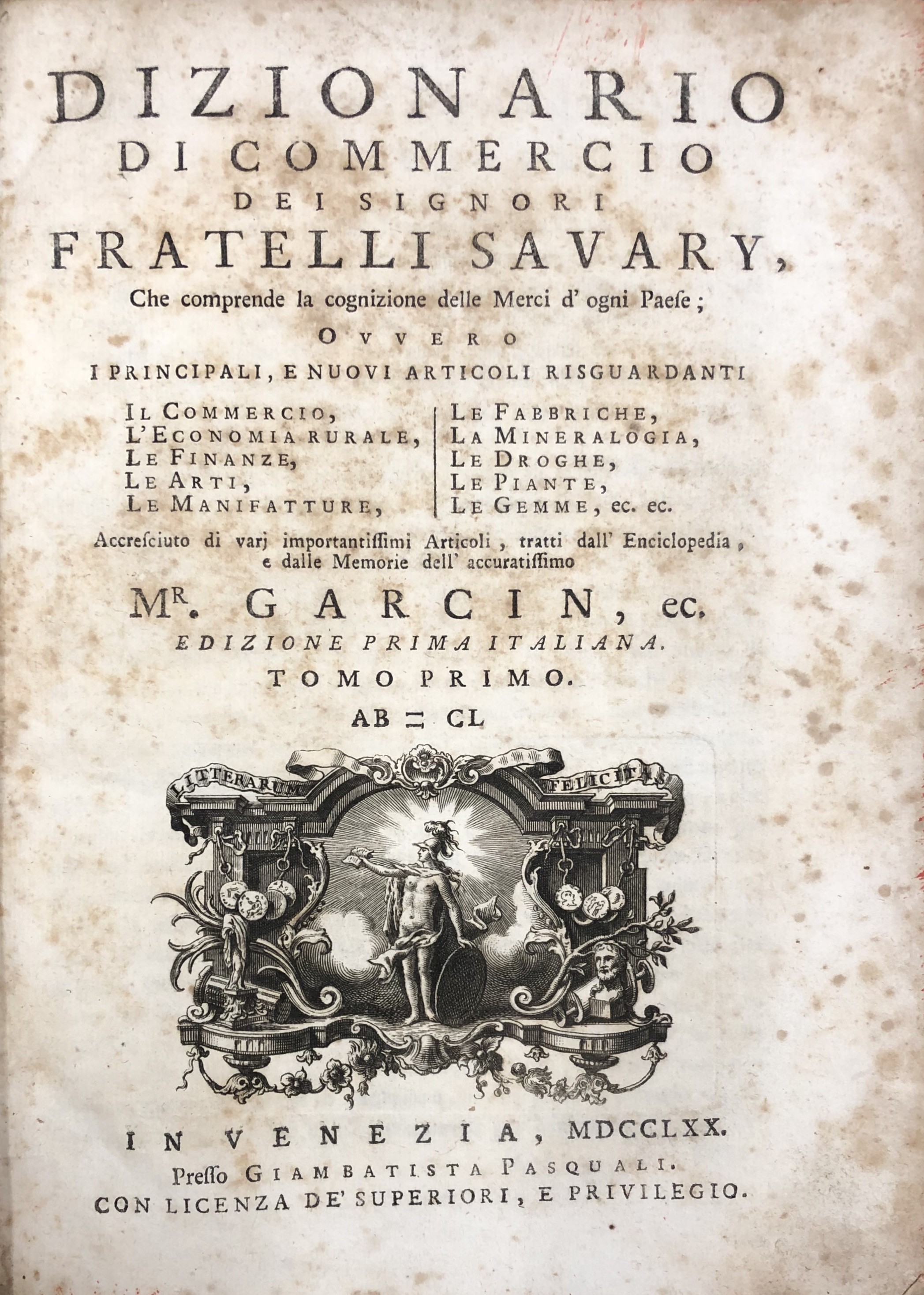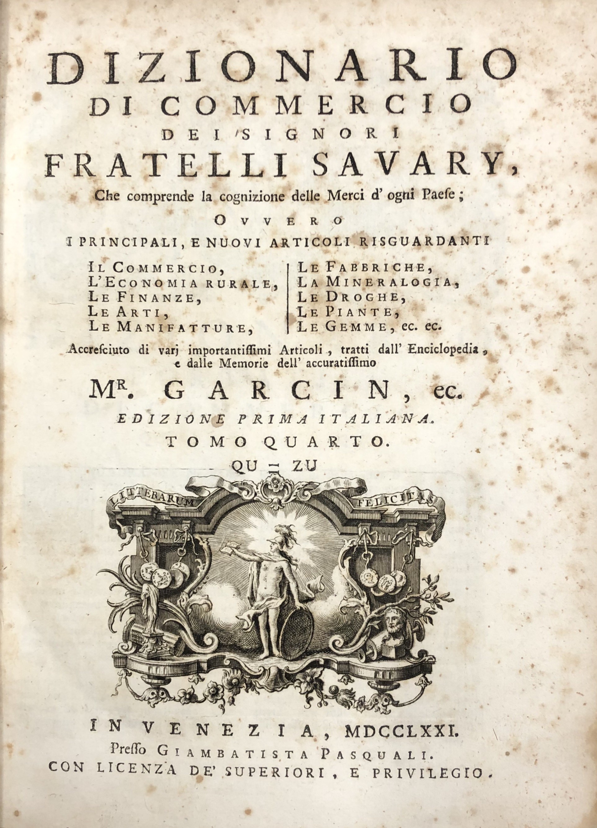 Dizionario di commercio dei signori fratelli Savary, che comprende la cognizione delle merci d'ogni paese; ovvero i principali, e i nuovi articoli risguardanti il commercio, l'economia rurale, le finanze, le arti, le manifatture, le fabbriche, la mineralogia, le droghe, le piante, le gemme, ec. ec. Edizione prima italiana. Vol. I - AB-CL; Vol. II - CO-KU; Vol. III - LA-PU; Vol. IV - QU-ZU
