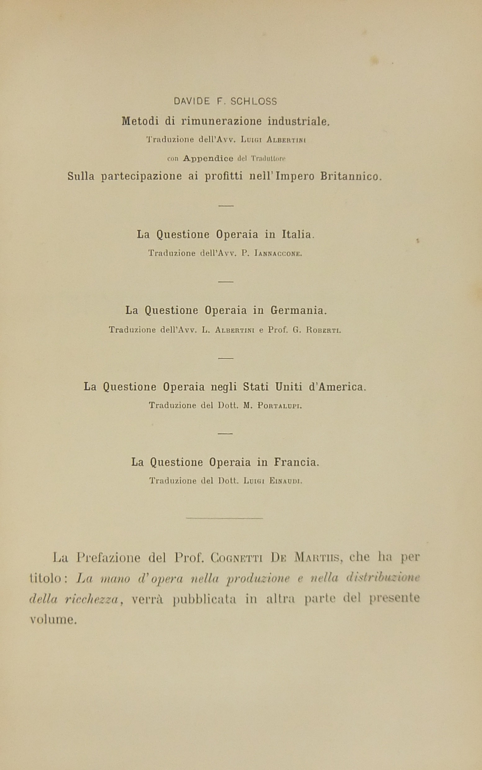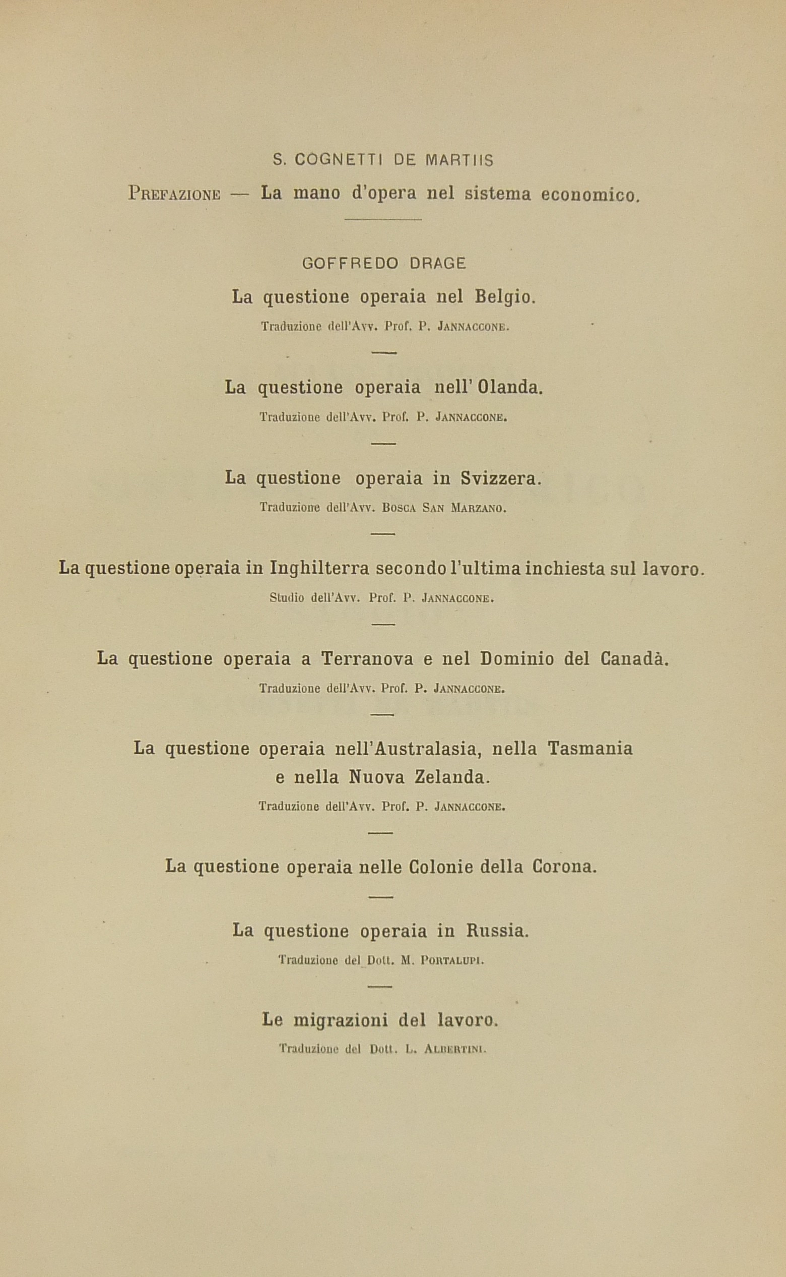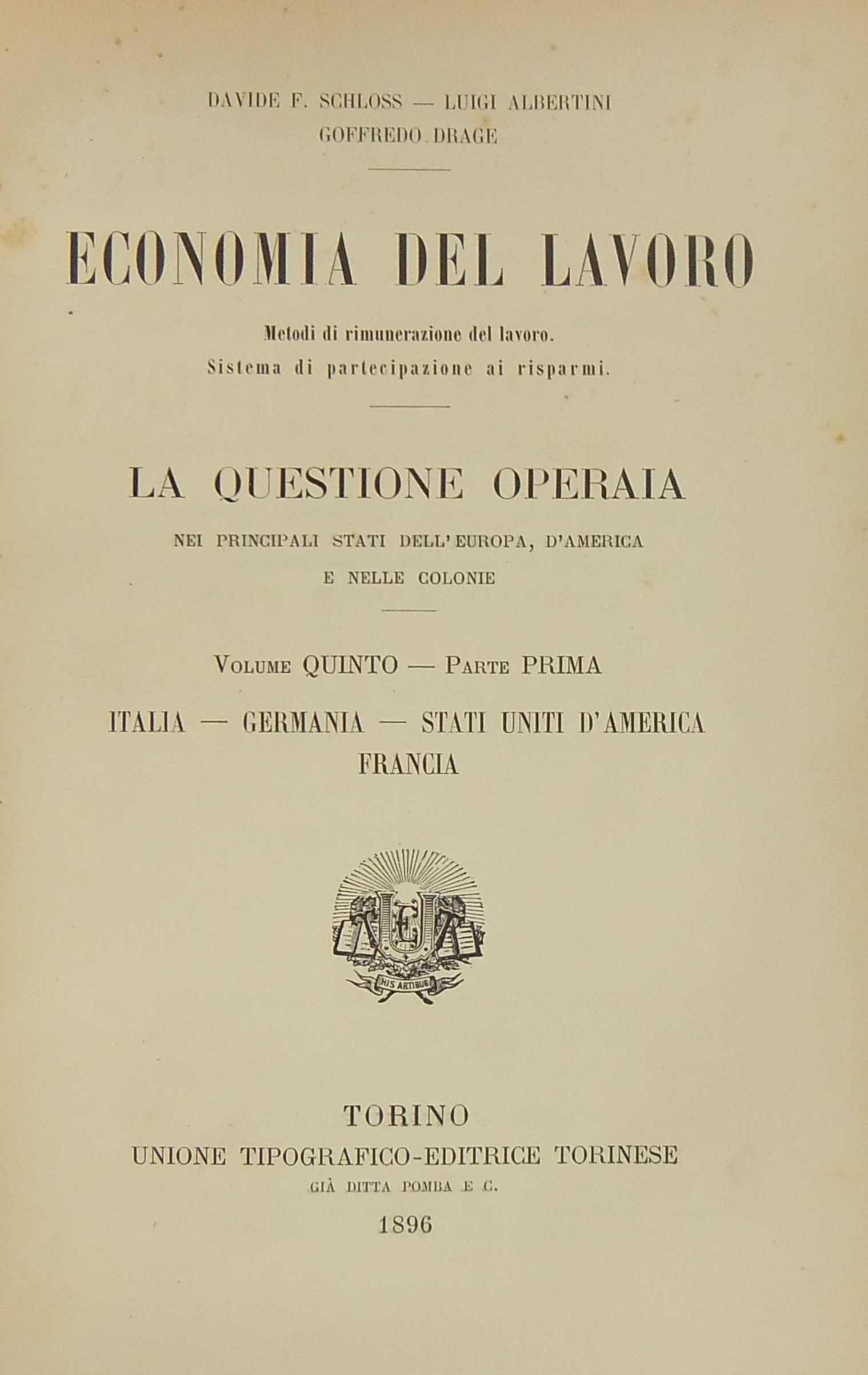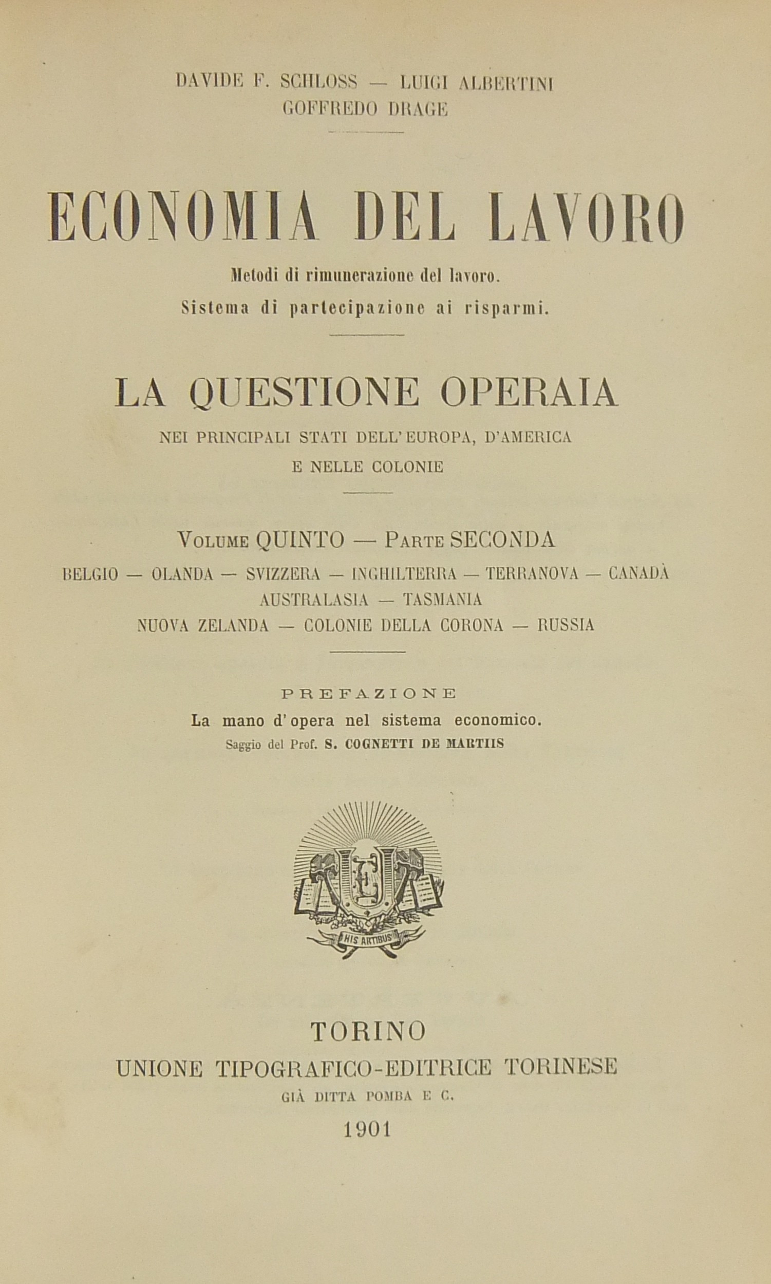 Economia del lavoro. Metodi di rimunerazione. Sistema di partecipazione ai risparmi. La questione operaia nei principali Stati dell'Europa, d'America e nelle colonie. Parte I - Italia, Germania, Stati Uniti d'America, Francia. Parte II - Belgio, Olanda, Svizzera, Inghilterra, Terranova, Canada, Australasia, Tasmania, Nuova Zelanda, Colonie della Corona, Russia. Prefazione di Salvatore Cognetti De Martiis: La mano d'opera nel sistema economico