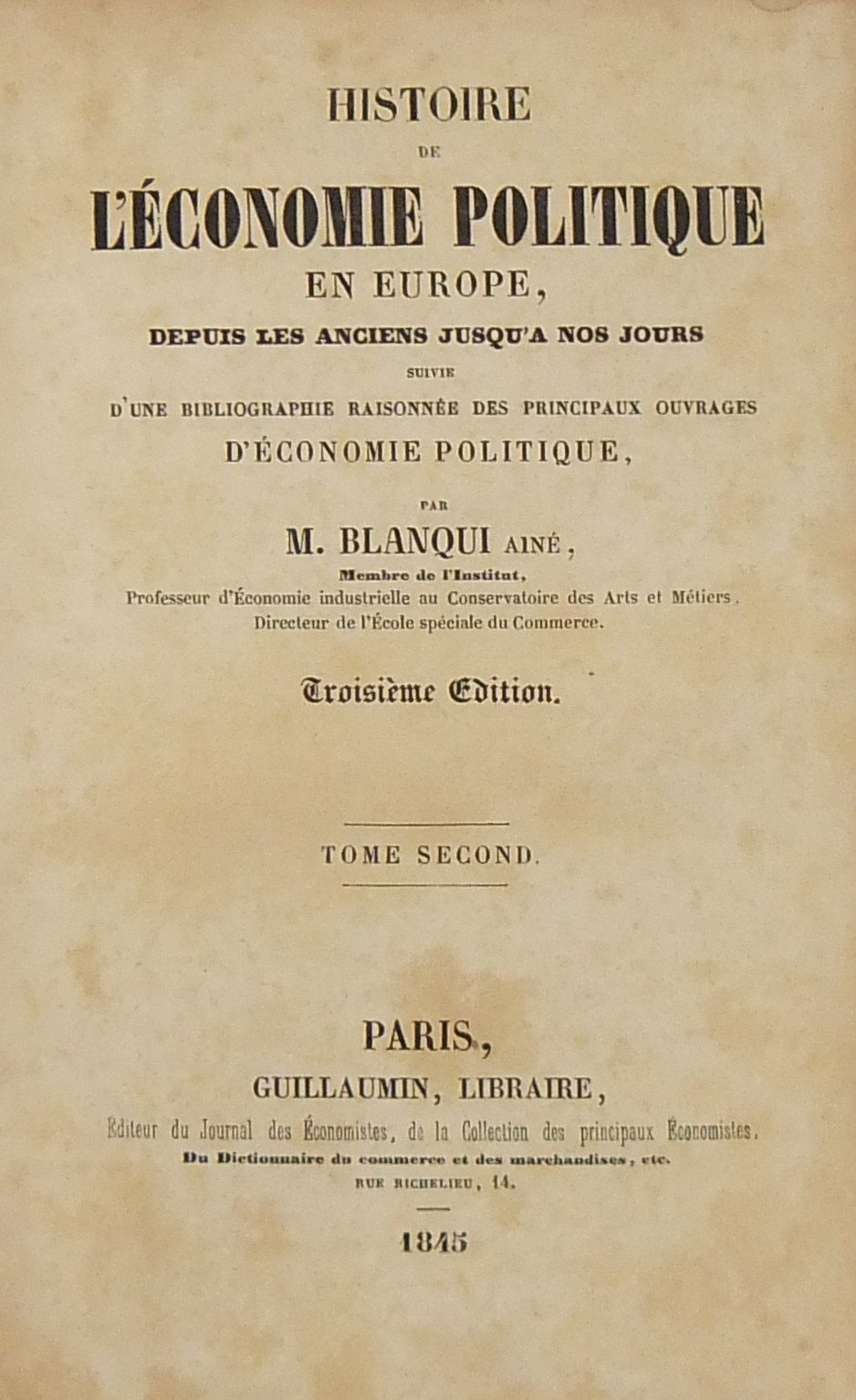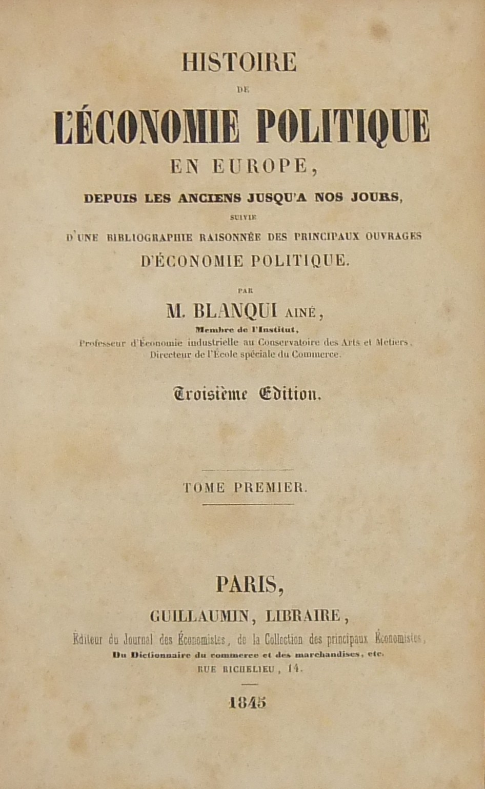 Histoire de l'économie politique en Europe depuis les anciens jusqu'à nos jours suivie d'une bibliographie raisonnée des principaux ouvrages d'économie politique