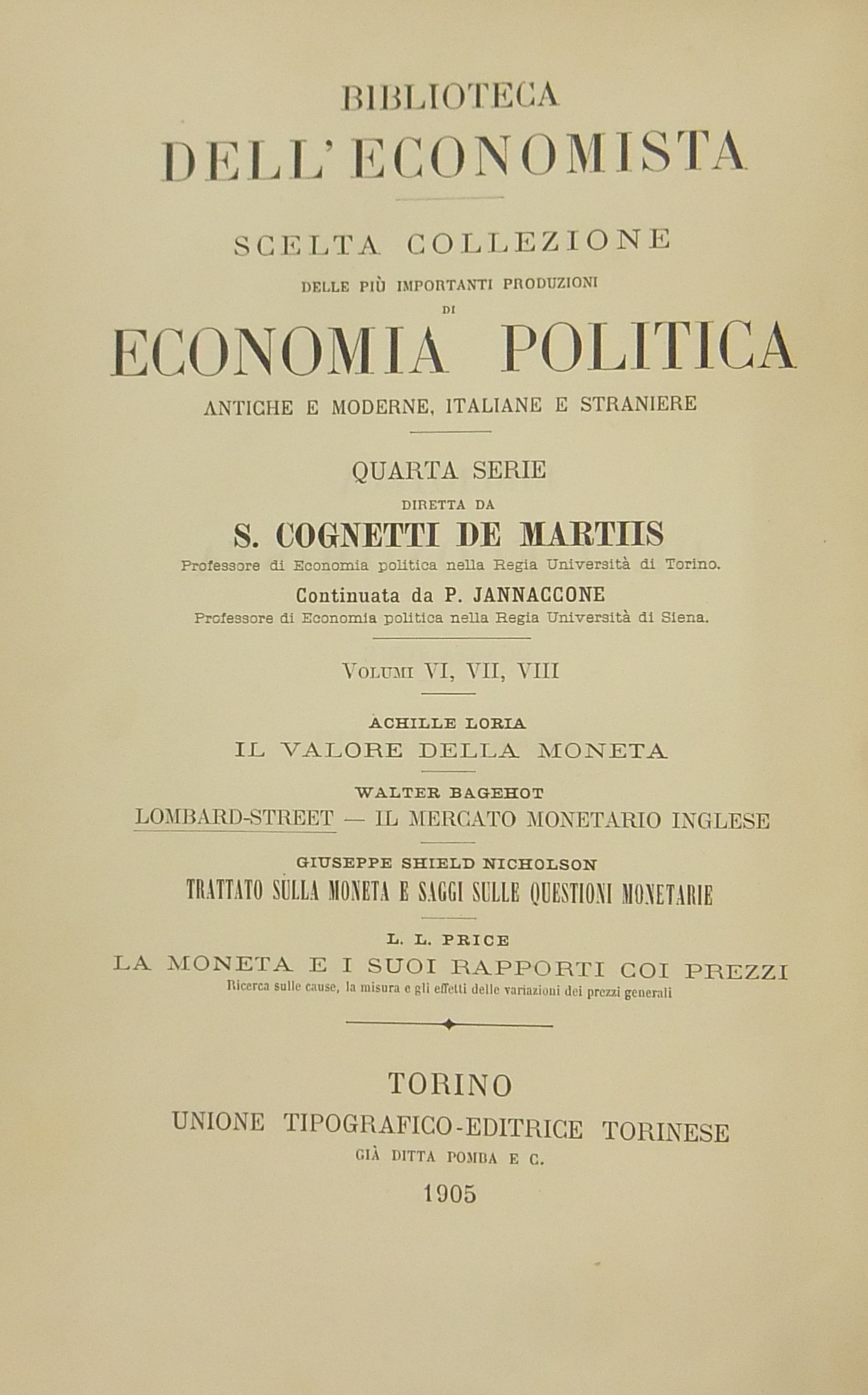 Il valore della moneta (Loria). Lombard-Street. Il mercato monetario inglese (Bagehot). Trattato sulla moneta e saggi sulle questioni monetarie (Shield Nicholson). La moneta e i suoi rapporti coi prezzi. Ricerca sulle cause la misura e gli effetti delle variazioni dei prezzi generali (Price)
