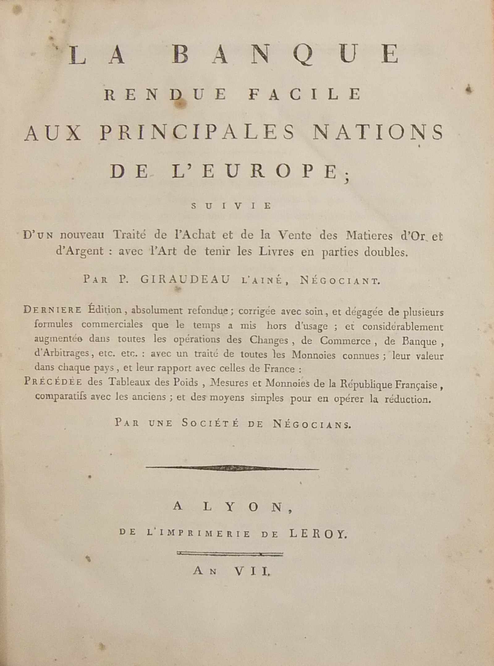 La Banque rendue facile aux principales nations de l'Europe; Suivie d'un nouveau Traite de l'Achat et de la Vente des Matieres d'Or et d'Argent: avec l'Art de tenir les Livres en parties doubles