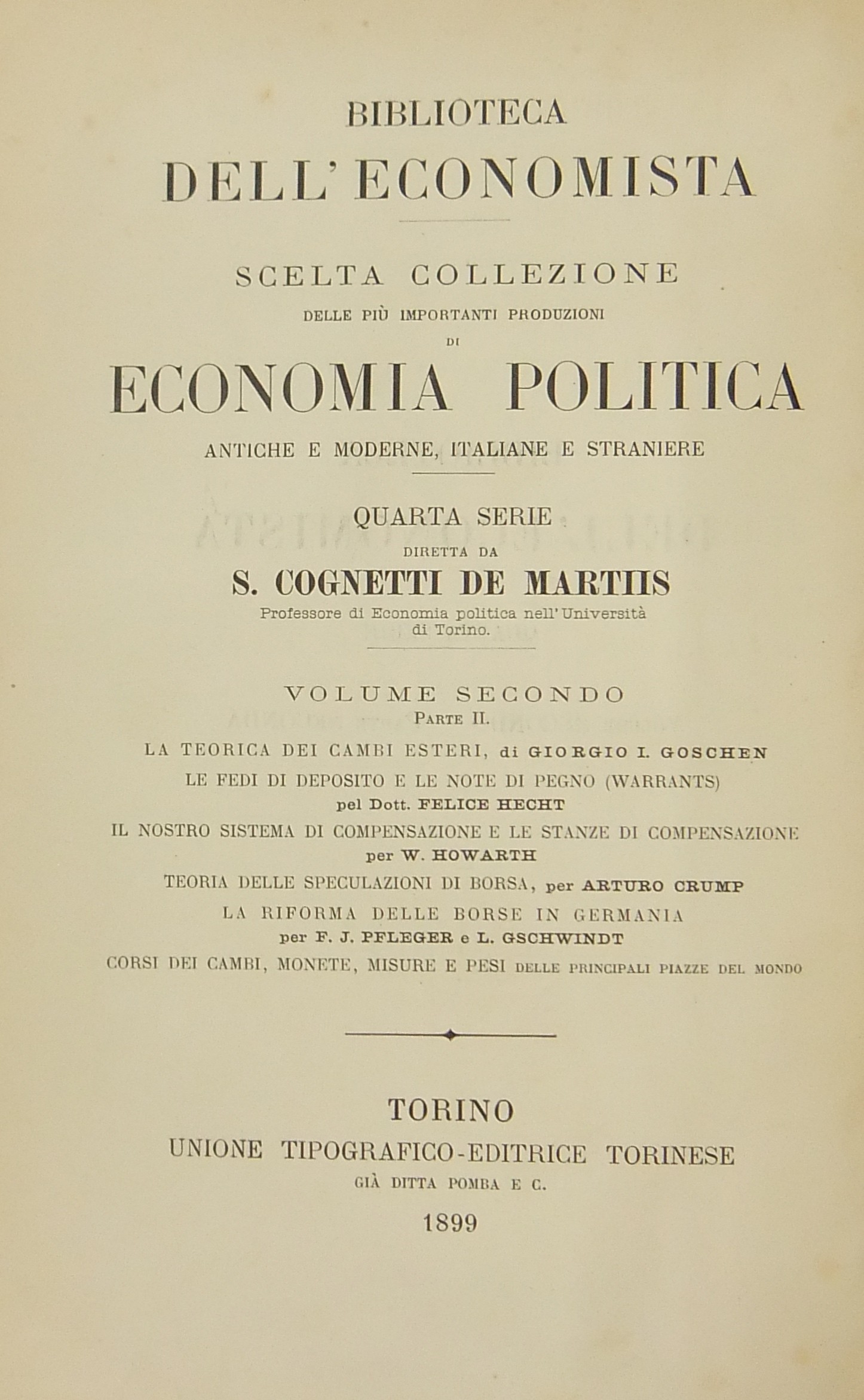 La teorica dei cambi esteri (Goschen). Le fedi di deposito e le note di pegno (Warrants) (Hecht). Il nostro sistema di compensazione e le stanze di compensazione (Howarth). Teoria delle speculazioni di borsa (Crump). La riforma delle borse in Germania (Pfleger - Gschwindt). Corsi dei cambi monete misure e pesi delle principali piazze del mondo