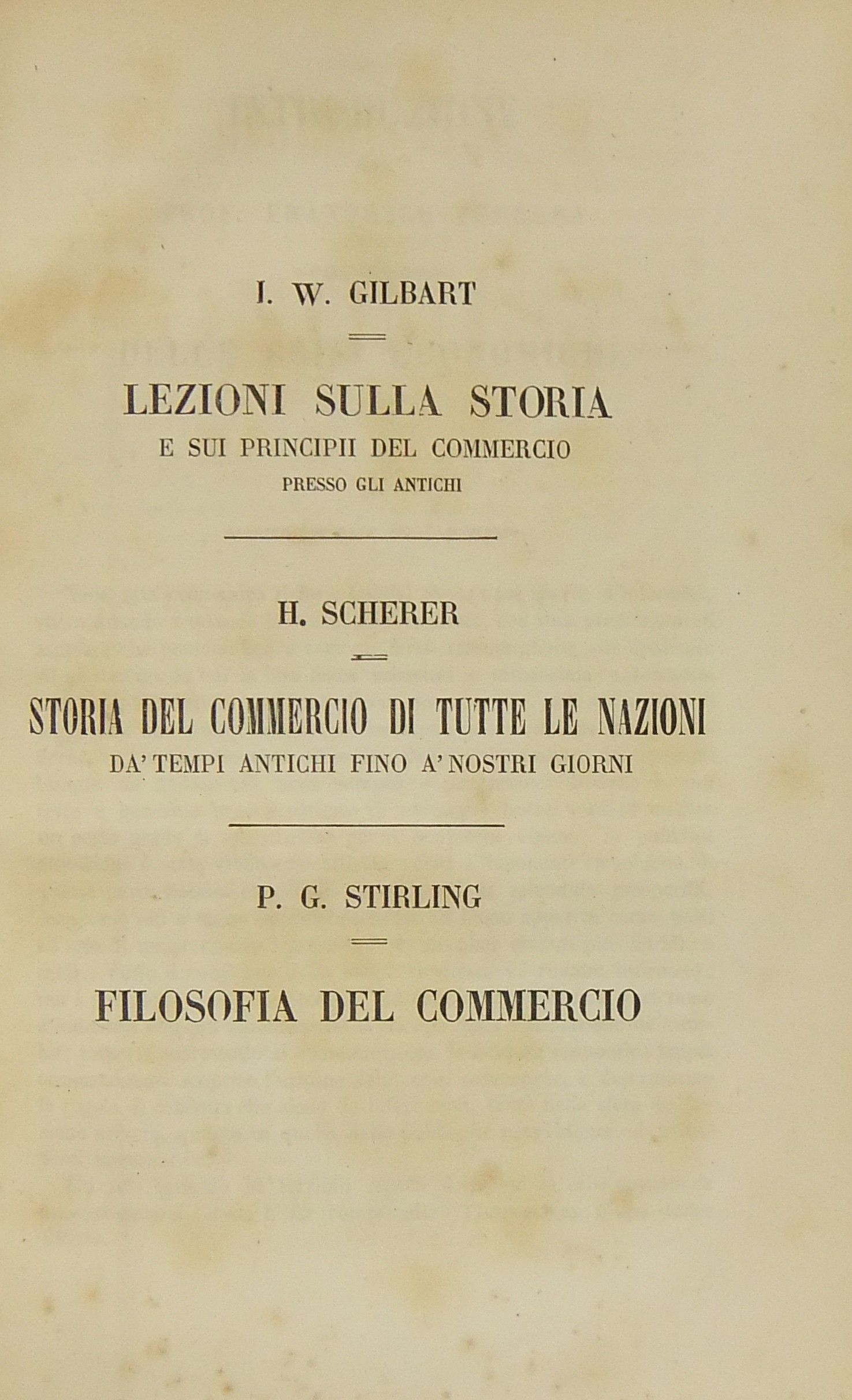 Gilbart - Lezioni sulla storia e sui principii del commercio presso gli antichi. Scherer - Storia del commercio di tutte le nazioni da' tempi antichi fino a' nostri giorni. Stirling - Filosofia del commercio. Introduzione di Francesco Ferrara
