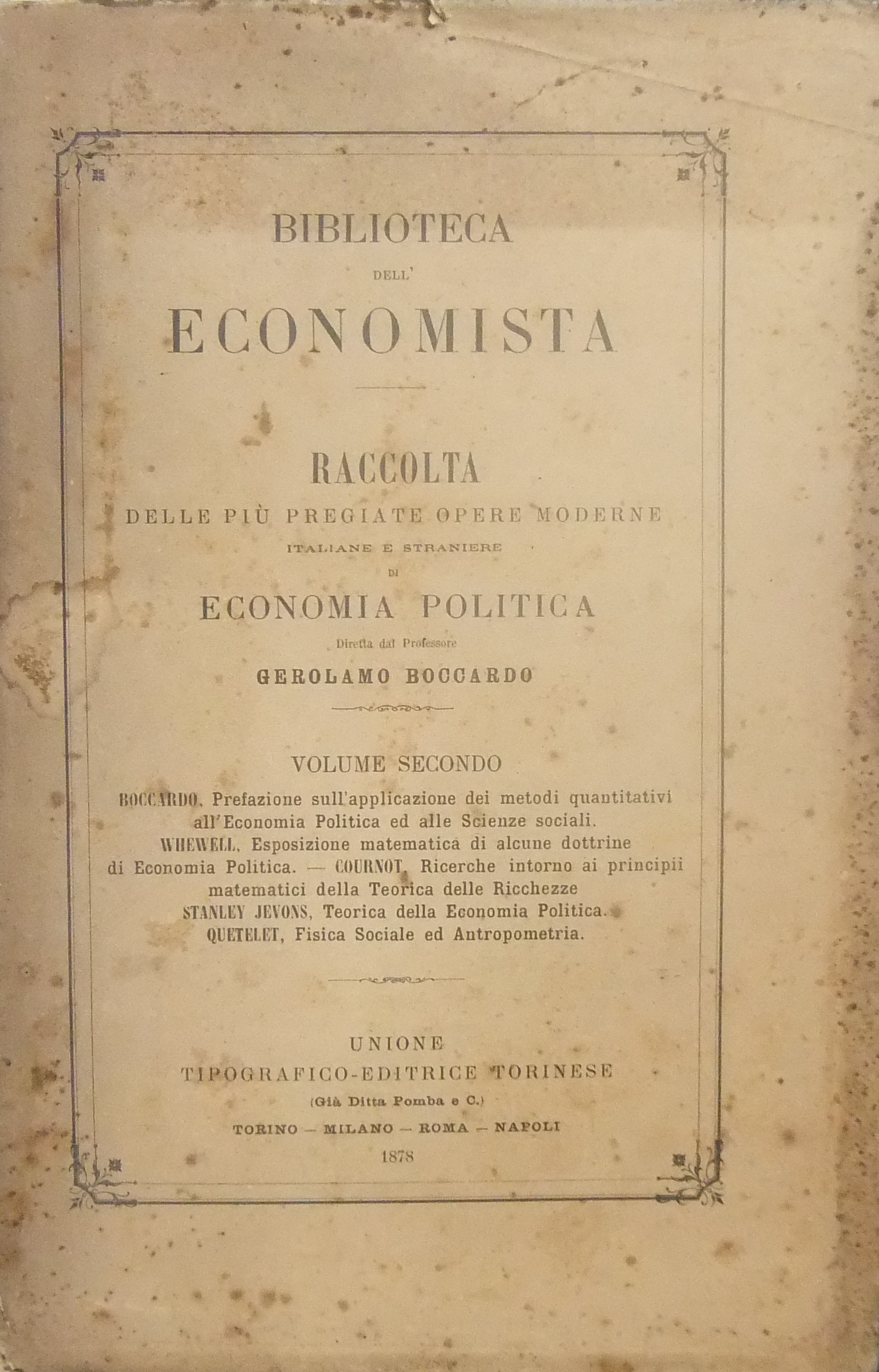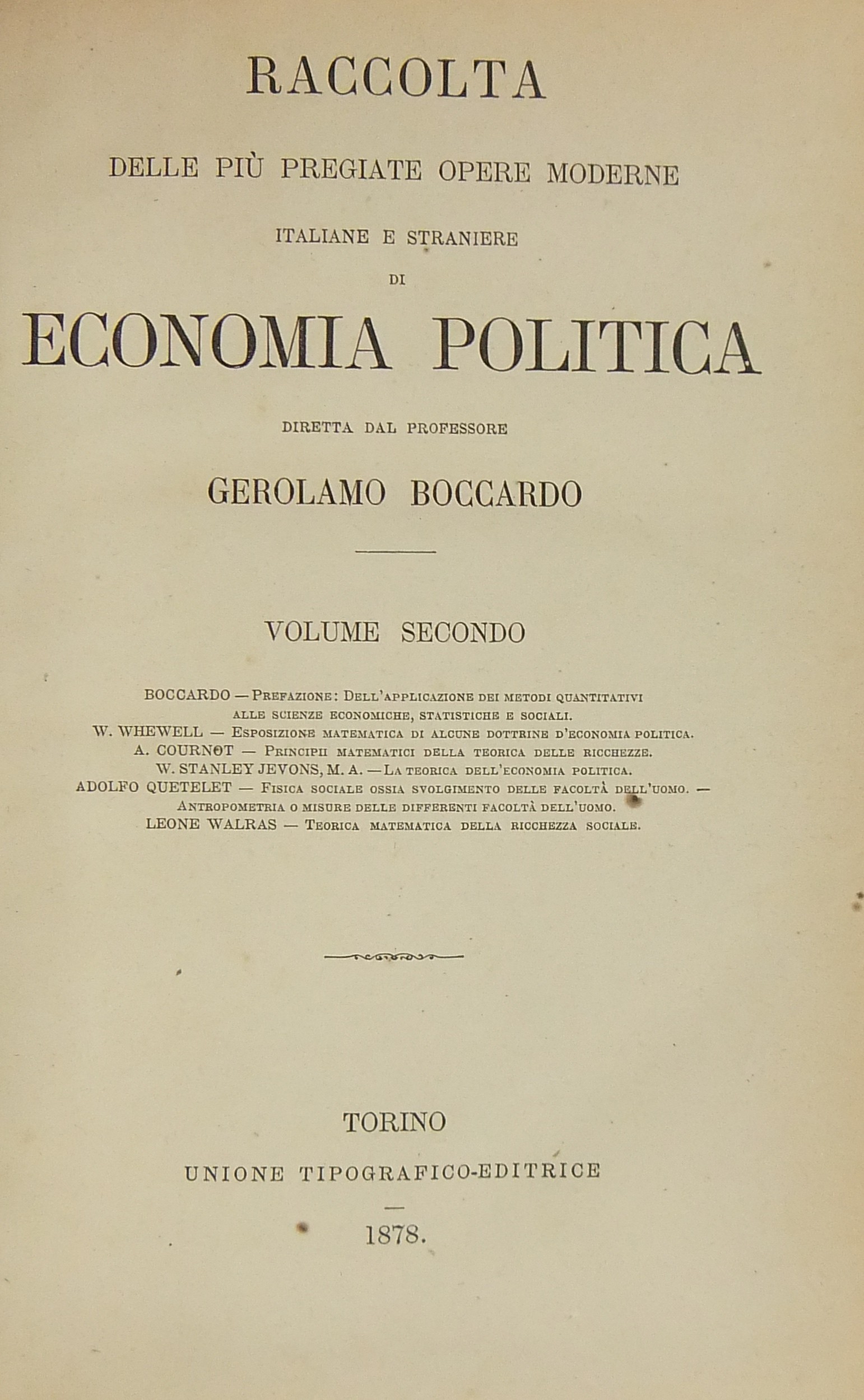 Prefazione sull'applicazione dei metodi quantitativi all'economia politica ed alle scienze sociali (Boccardo). Esposizione matematica di alcune dottrine di economia politica (Whewell). Principii matematici della teorica delle ricchezze (Cournot). La teorica dell'economia politica (Stanley Jevons). Fisica sociale ossia svolgimento delle facoltà dell'uomo (Quetelet). Antropometria o misure delle differenti facoltà dell'uomo (Quetelet). Teorica matematica della ricchezza sociale (Walras). Introduzione di Gerolamo Boccardo