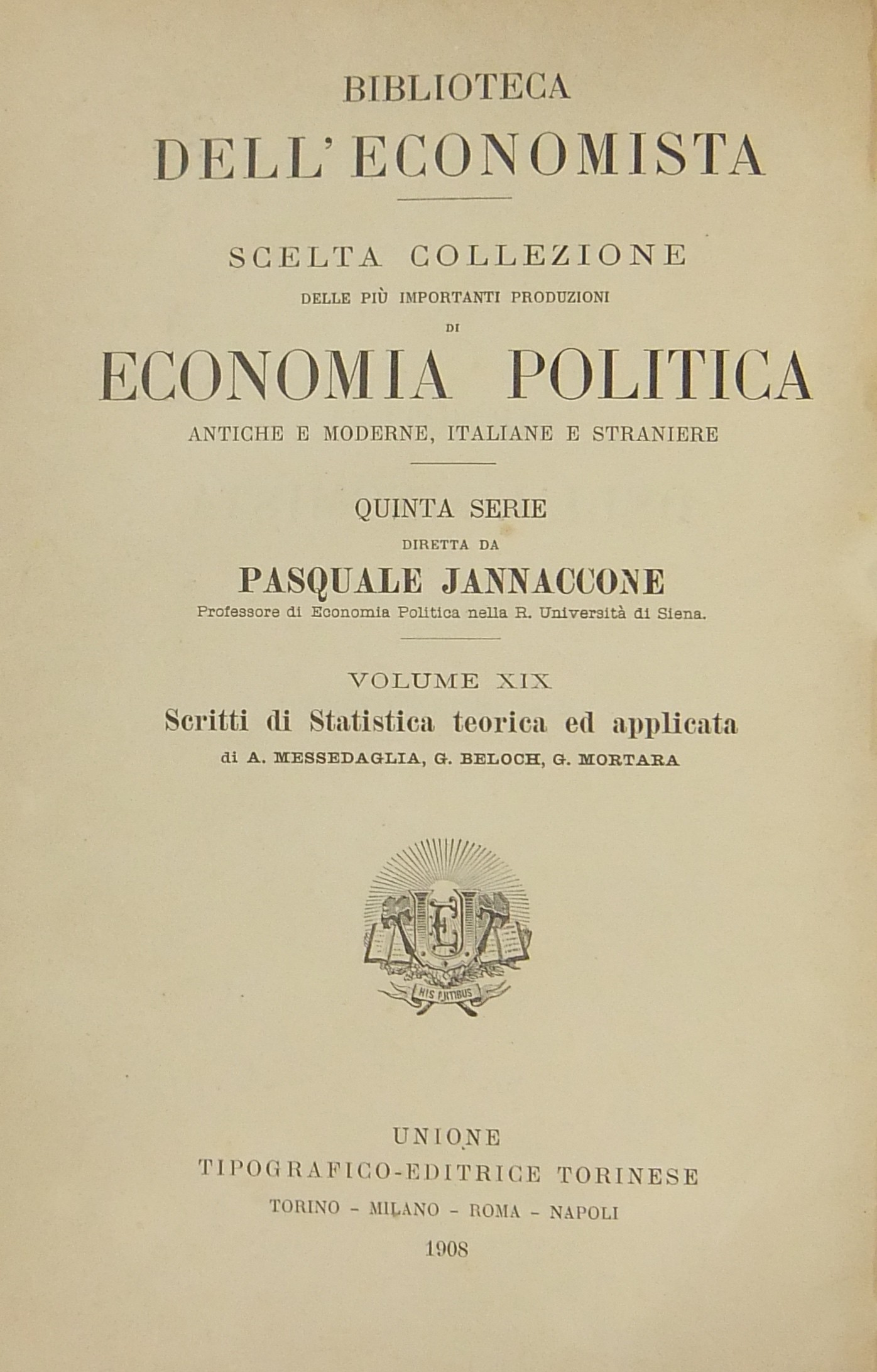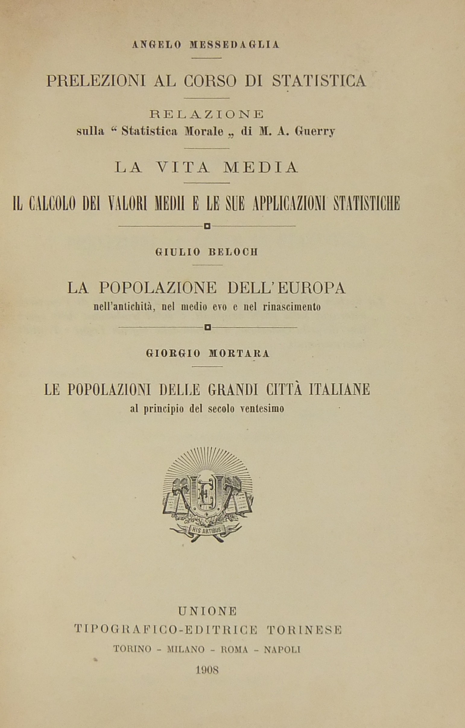 Prelezioni al corso di statistica (Messedaglia). Relazione sulla Statistica morale di M.A. Guerry (Messedaglia). La vita media (Messedaglia). Il calcolo dei valori medii e le sue applicazioni statistiche (Messedaglia). La popolazione dell'Europa nell'antichità nel Medio Evo e nel Rinascimento (Beloch). Le popolazioni delle grandi città italiane al principio del secolo ventesimo (Mortara)