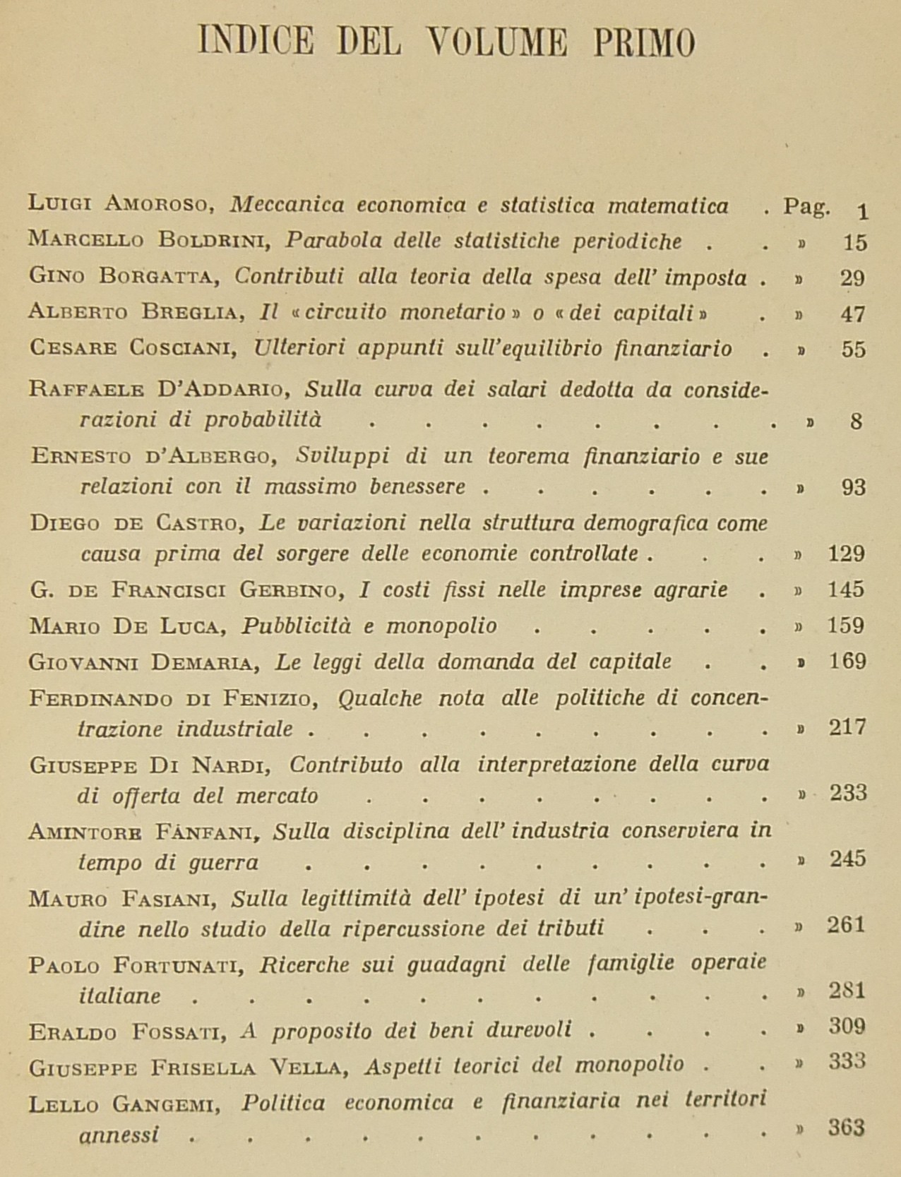 Scritti di: Amoroso, Boldrini, Borgatta, Breglia, Cosciani, D’Addario, D’Albergo, De Castro, De Francisci, Gerbino, De Luca, Demaria, Di Fenizio, Di Nardi, Fanfani, Fasiani, Fortunati, Fossati, Frisella Vella, Gangemi, Gini, Griziotti, Lanzillo, Lasorsa, La Volpe, Lorenzoni, Papi, Pietra, Resta, Ricca Salerno, Serpieri, Vanoni, Vito.