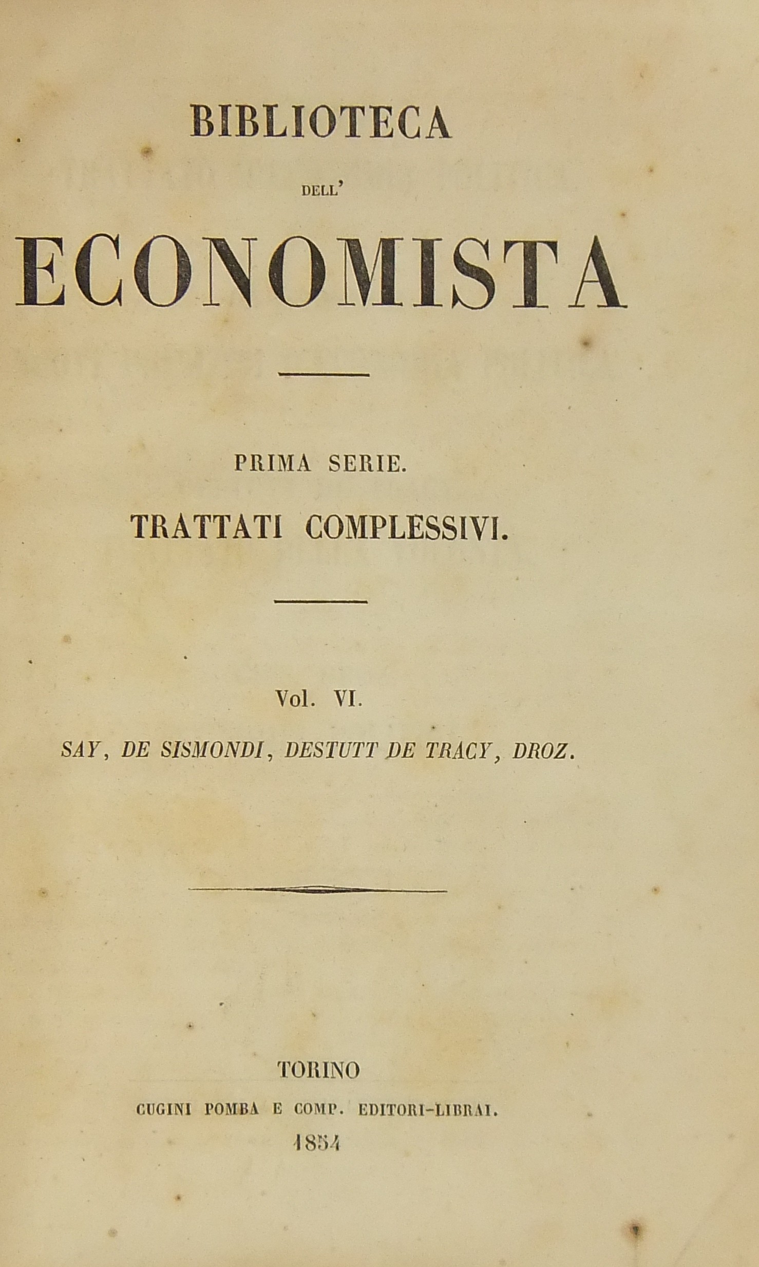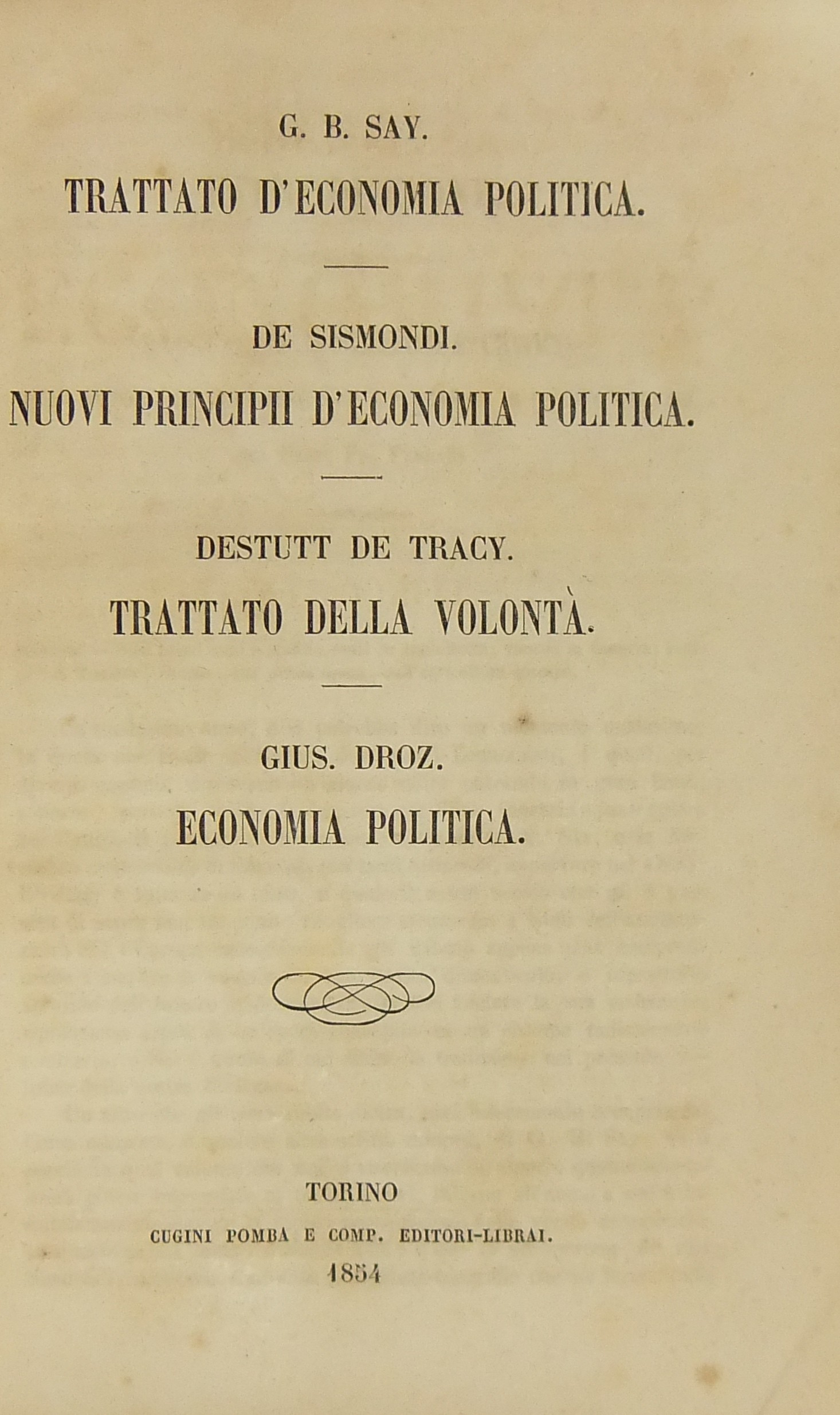 (Say) - Trattato d'economia politica. (De Sismondi) - Nuovi principi d'economia politica. (Destutt De Tracy) - Trattato della volontà . (Droz) - Economia politica. Introduzione di Francesco Ferrara