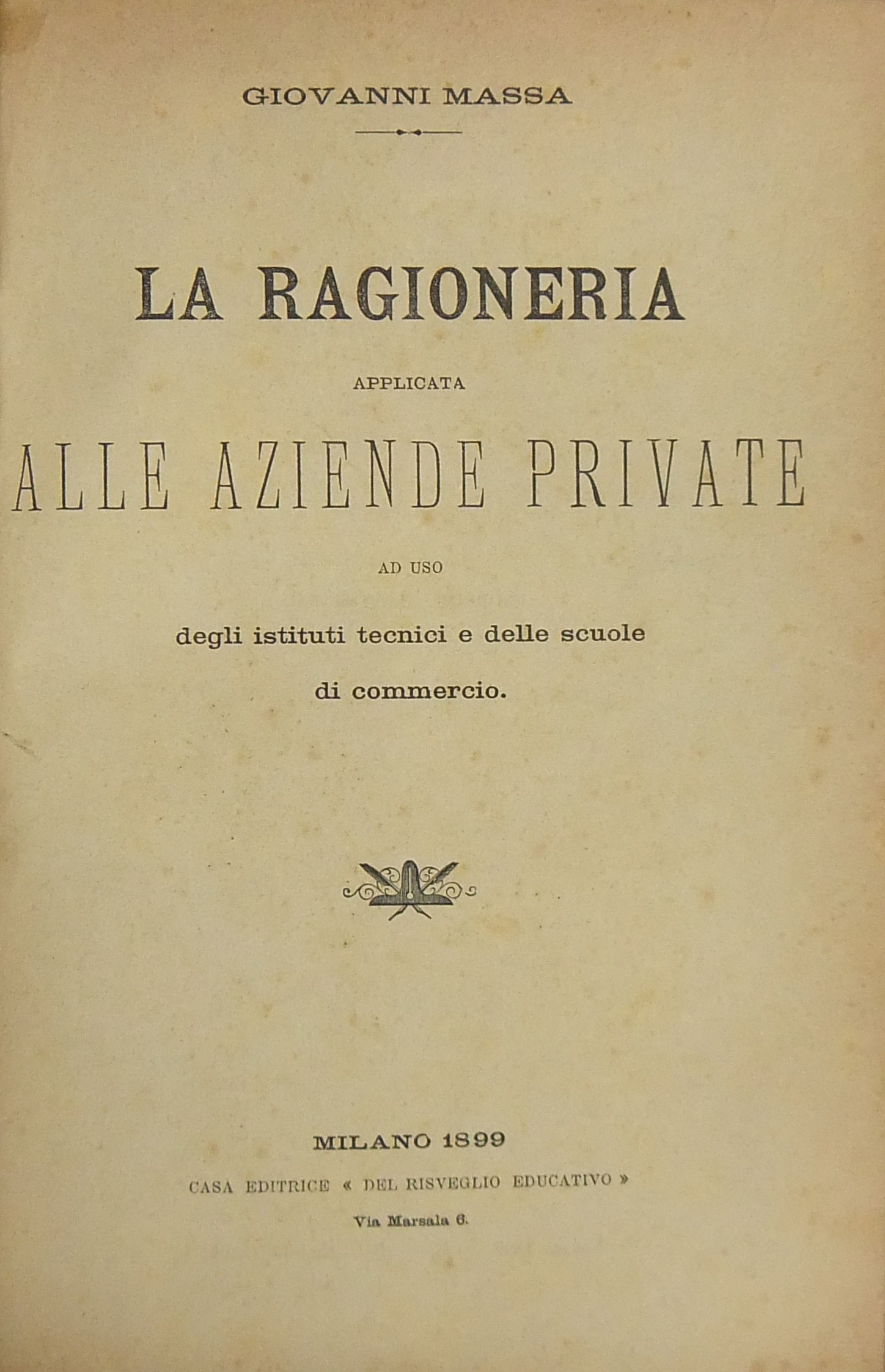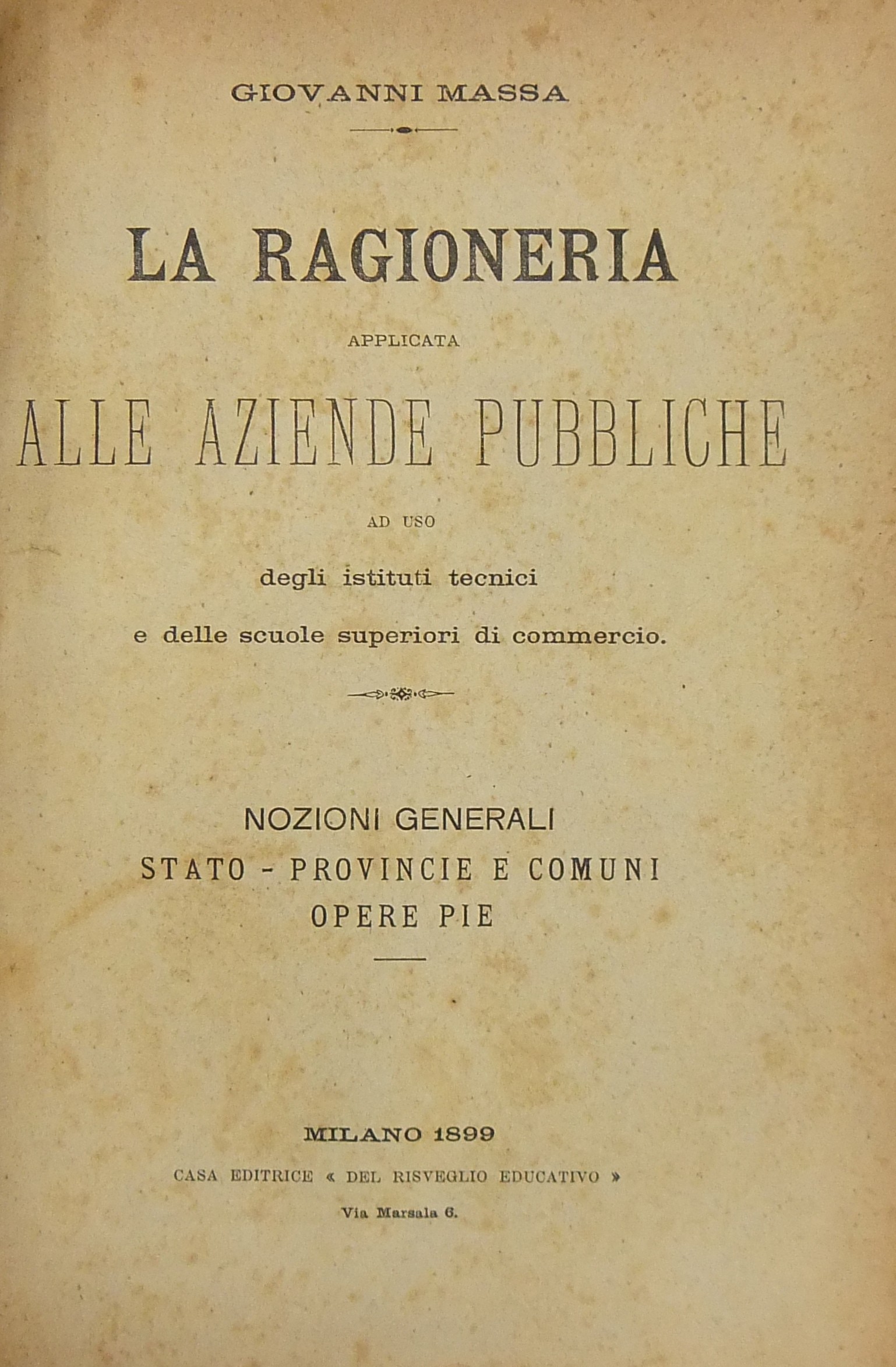 Trattato di ragioneria teoretica ad uso degli istituti tecnici e delle scuole di commercio. UNITO A: La ragioneria applicata alle aziende pubbliche ad uso degli istituti tecnici e delle scuole superiori di commercio. Nozioni generali. Stato. Provincie e Comuni. Opere pie. (1899 pp. 319). UNITO A: La ragioneria applicata alle aziende private ad uso degli istituti tecnici e delle scuole di commercio. (1899 pp. VIII + 271).
