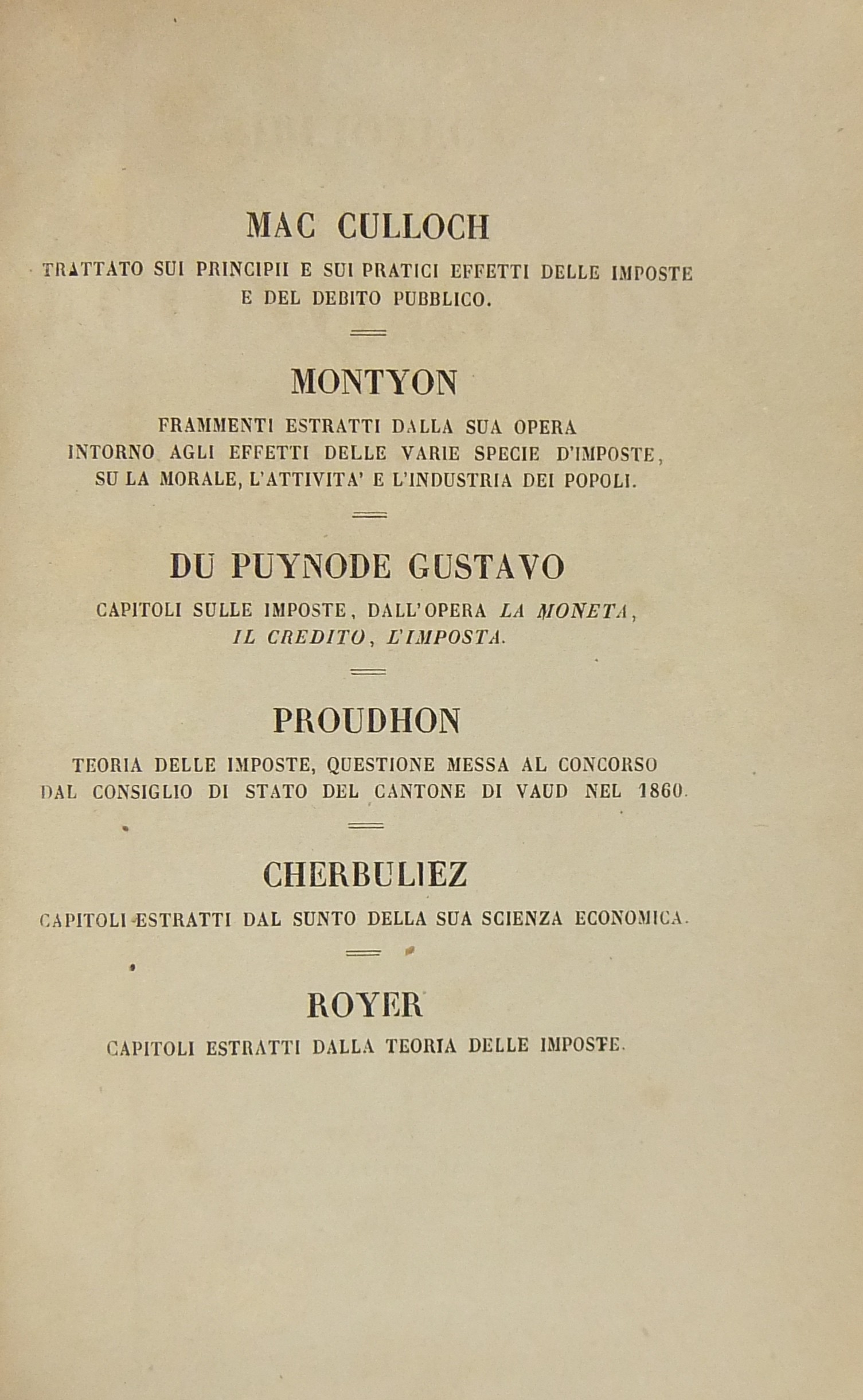 Trattato sui principii e sui pratici effetti delle imposte e del debito pubblico (Mc Culloch). Estratti intorno agli effetti delle varie specie d'imposte su la morale l'attività e l'industria dei popoli (Montyon). Capitoli sulle imposte dall'opera La moneta il credito l'imposta (Du Puynode). Teoria delle imposte questione messa al concorso dal Consiglio di Stato del Cantone di Vaud nel 1860 (Proudhon). Capitoli estratti dal sunto della Scienza Economica (Cherbuliez). Capitoli estratti dalla Teoria delle Imposte (Royer)