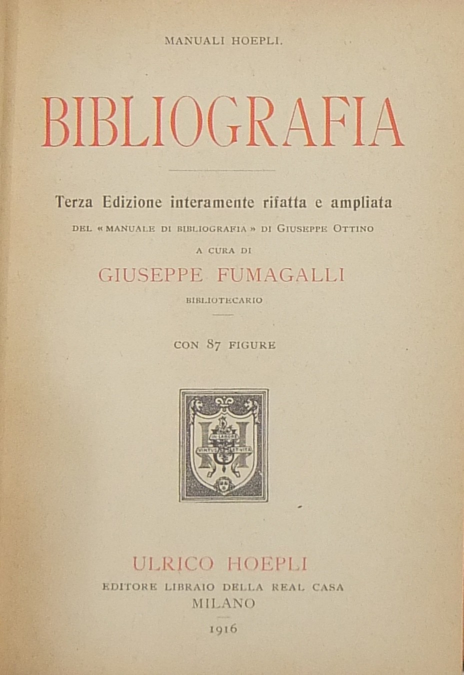 Terza edizione interamente rifatta e ampliata del Manuale di bibliografia di Giuseppe OttinoLuogo: Milano