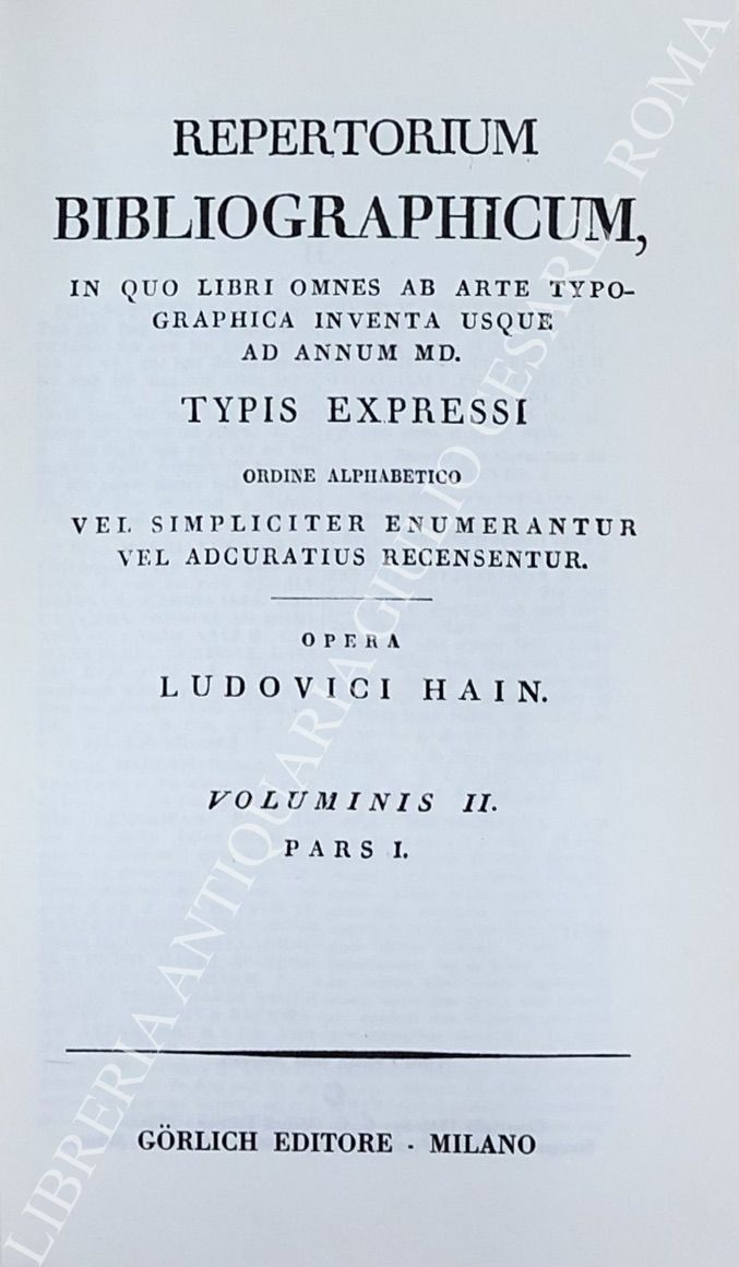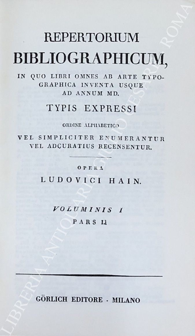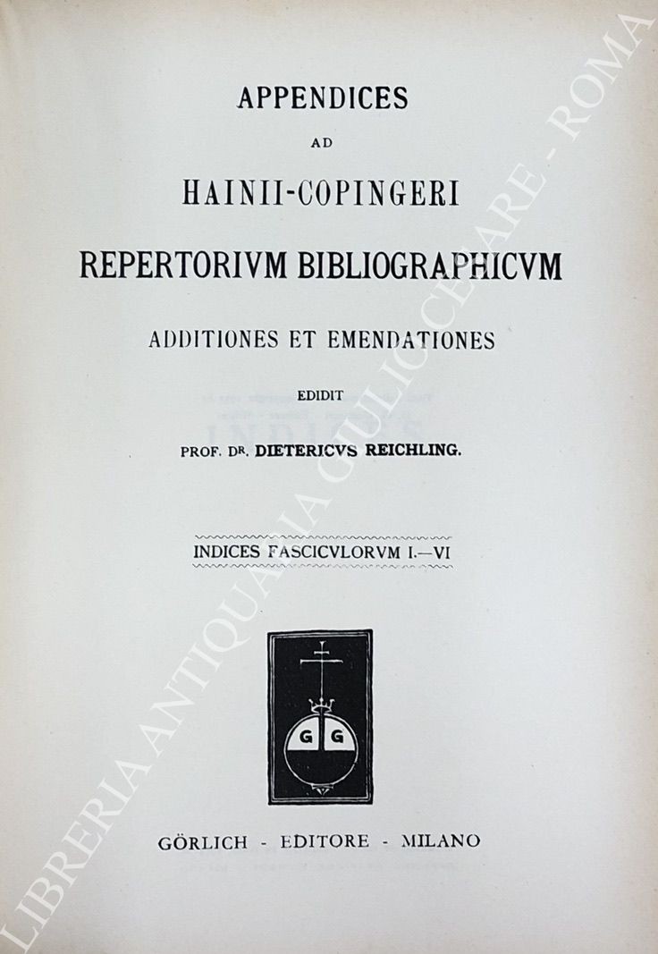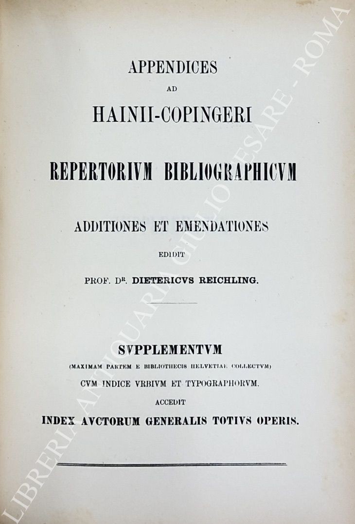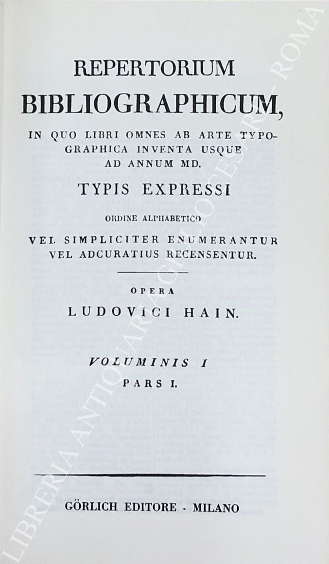 Repertorium bibliographicum, in quo libri omnes ab arte typographica inventa usque ad annum MD. Vol. I - A-B; Vol. II - C-G; Vol. III - H-O; Vol. IV - P-Z; UNITO A: Supplement to Hain's Repertorium bibliographicorum. Part I; Part II, Vol. I: Abano-Ovidius; Part II, Vol. II: Pablo-Zutphania. With addenda to parts I and II ad index by Konrad Burger. UNITO A: Appendices ad Haiti-Copingeri; Repertorium bibliographicum, Additionen et emendationes edidit Dietericus Reichling. Fasciculus I; Fasciculus II; Fasciculus III; Fasciculus IV; Fasciculus V; Fasciculus VI; Indices fasciculorum I-VI; Supplementum (maximam partem e bibliothecis helvetiae collectum) cum indice erbium et typographorum. Accedit index auctorum generalis totius operis