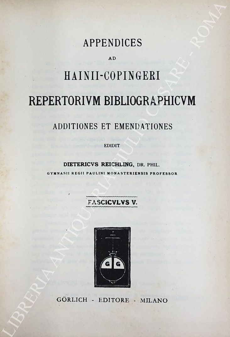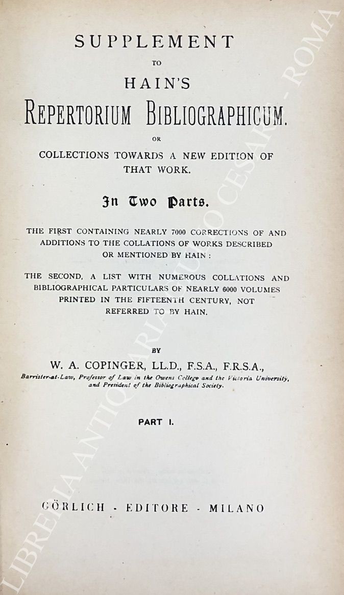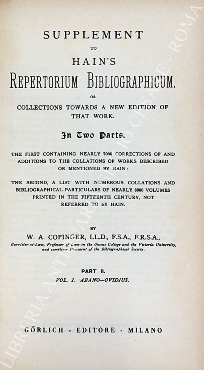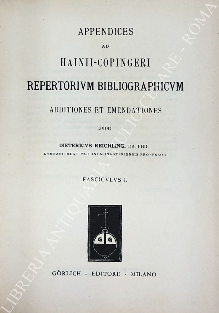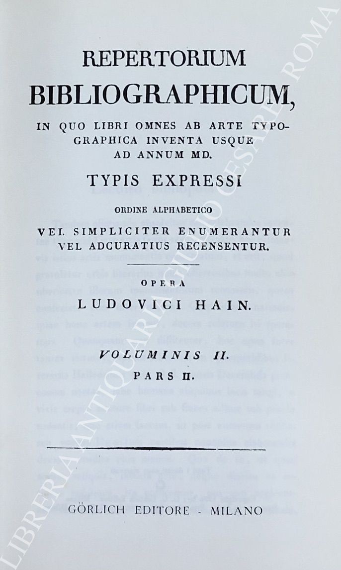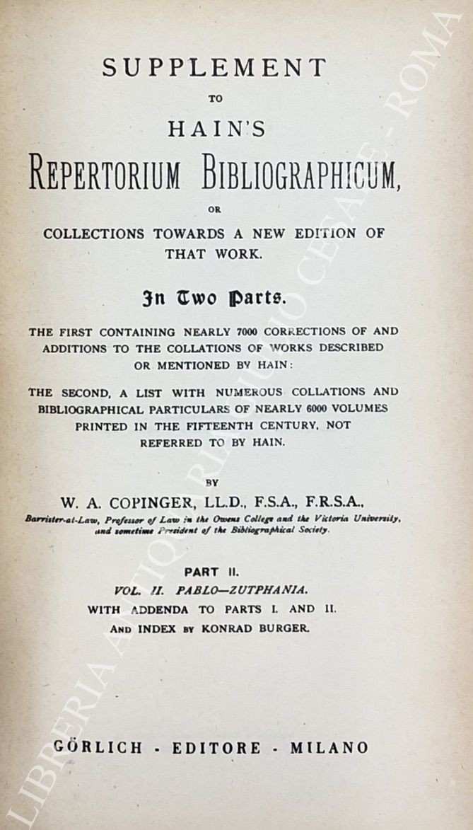 Repertorium bibliographicum, in quo libri omnes ab arte typographica inventa usque ad annum MD. Vol. I - A-B; Vol. II - C-G; Vol. III - H-O; Vol. IV - P-Z; UNITO A: Supplement to Hain's Repertorium bibliographicorum. Part I; Part II, Vol. I: Abano-Ovidius; Part II, Vol. II: Pablo-Zutphania. With addenda to parts I and II ad index by Konrad Burger. UNITO A: Appendices ad Haiti-Copingeri; Repertorium bibliographicum, Additionen et emendationes edidit Dietericus Reichling. Fasciculus I; Fasciculus II; Fasciculus III; Fasciculus IV; Fasciculus V; Fasciculus VI; Indices fasciculorum I-VI; Supplementum (maximam partem e bibliothecis helvetiae collectum) cum indice erbium et typographorum. Accedit index auctorum generalis totius operis