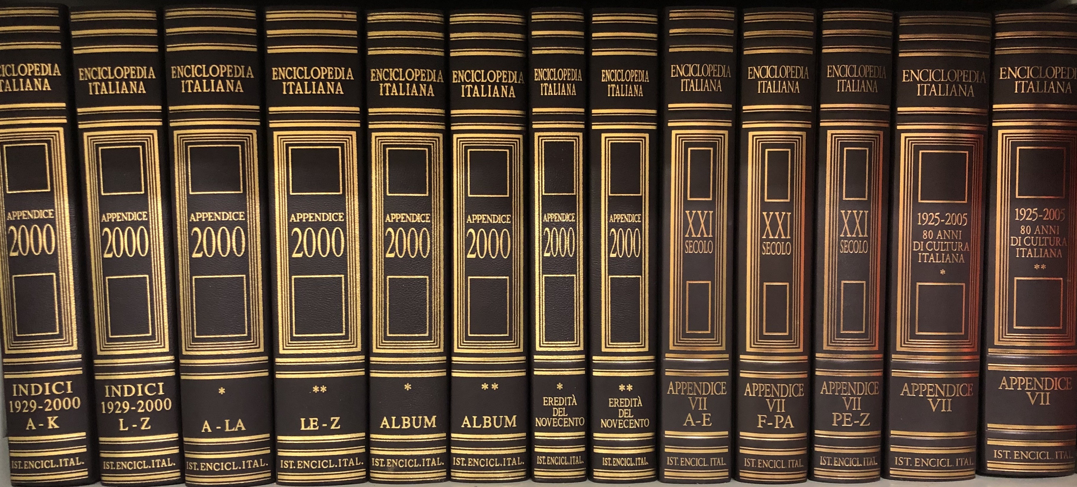 35 voll + Indice + prima appendice + seconda appendice: 1938-1948 in 2 volumi + terza appendice: 1949-1960 in 2 volumi + quarta appendice: 1961-1978 in 3 volumi + quinta appendice: 1979-1992 in 5 volumi + appendice 2000 in 2 volumi + appendice 2000: Indici 1929-2000 in 2 volumi + appendice 2000: Album in 2 volumi + appendice 2000: Eredità del Novecento in 2 volumi + appendice VII: XXI secolo in 3 volumi + appendice VII: 1925-2005: 80 anni di cultura italiana in 2 volumi per un totale di 62 tomi
