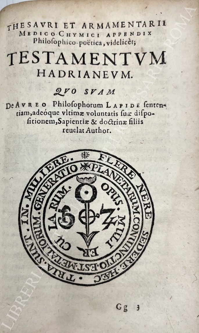 Pregevole edizione dell'opera del medico e alchimista tedesco. Il "Thesaurus" contiene la descrizione di numerosi preparati medici e chimico-farmaceutici; La seconda parte, il "Testamentum Hadrianeum" è interamente dedicata all'alchimia. Bella figura cabalistica xilografata nel testo