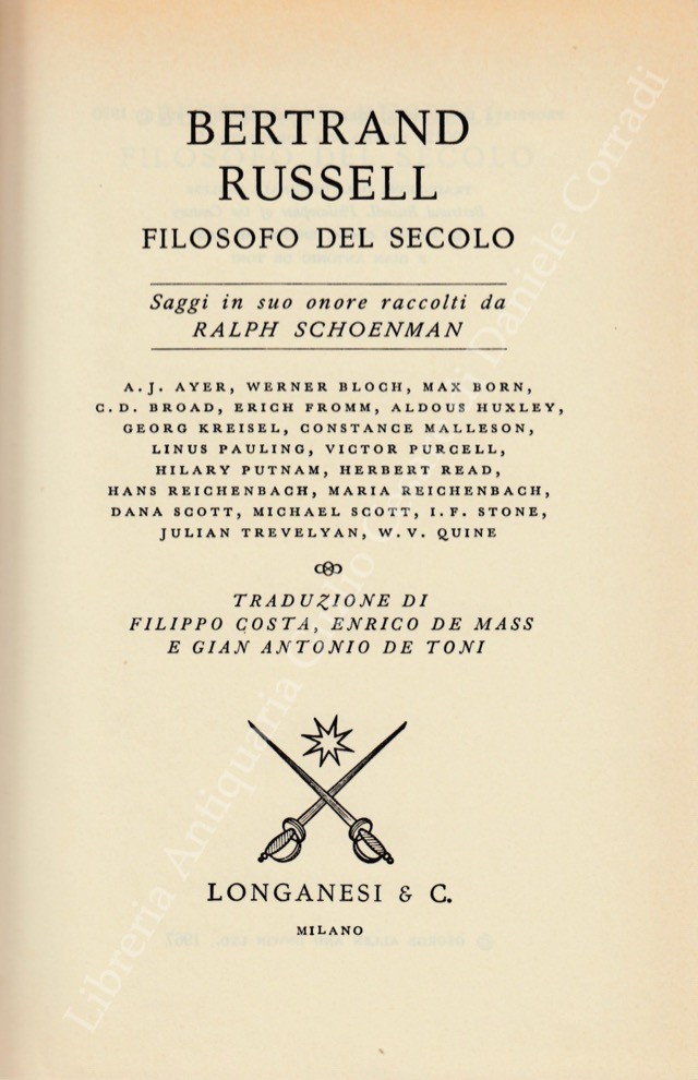 Russell filosofo del secolo. Saggi in suo onore raccolti da Ralph Schoenman. Traduzione di Filippo Costa, Enrico De Mass e Gian Antonio De Toni