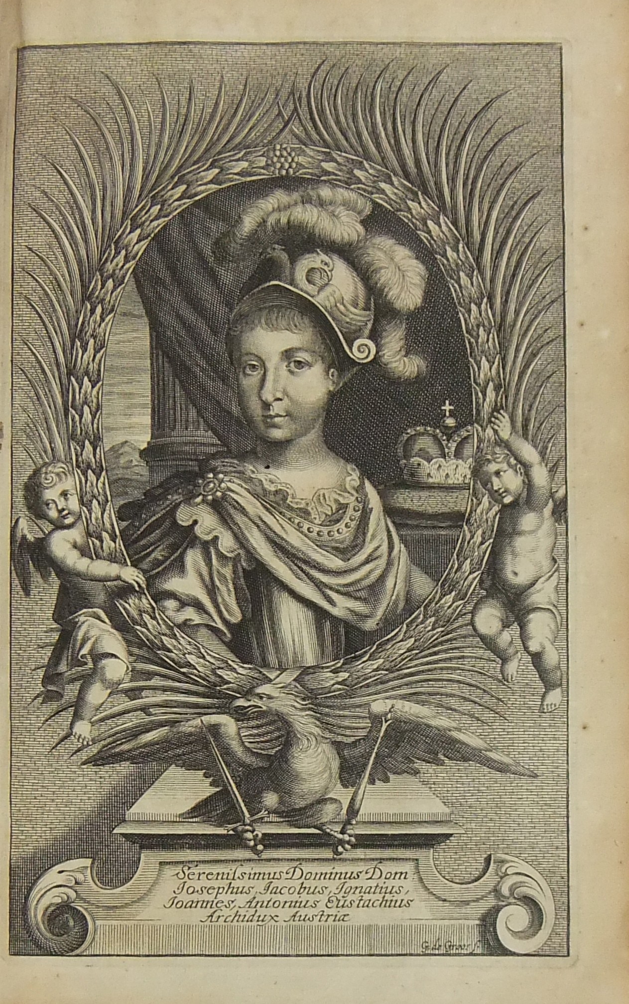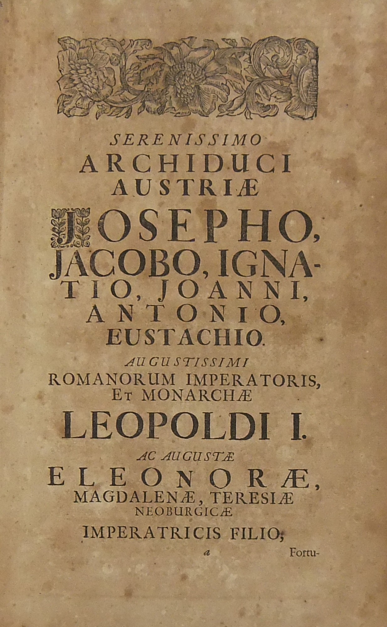 Bellissime incisioni a piena pagina ad inizio volume raffiguranti l’autore e l’arciduca d’Austria. Frontespizio bicromatico capilettere ornati finalini, Una tavola di Arbor all’interno. Omesse nella numerazione le p. 377-380. Ritratto calcografico del dedicatario inciso da Gerard de Groos.