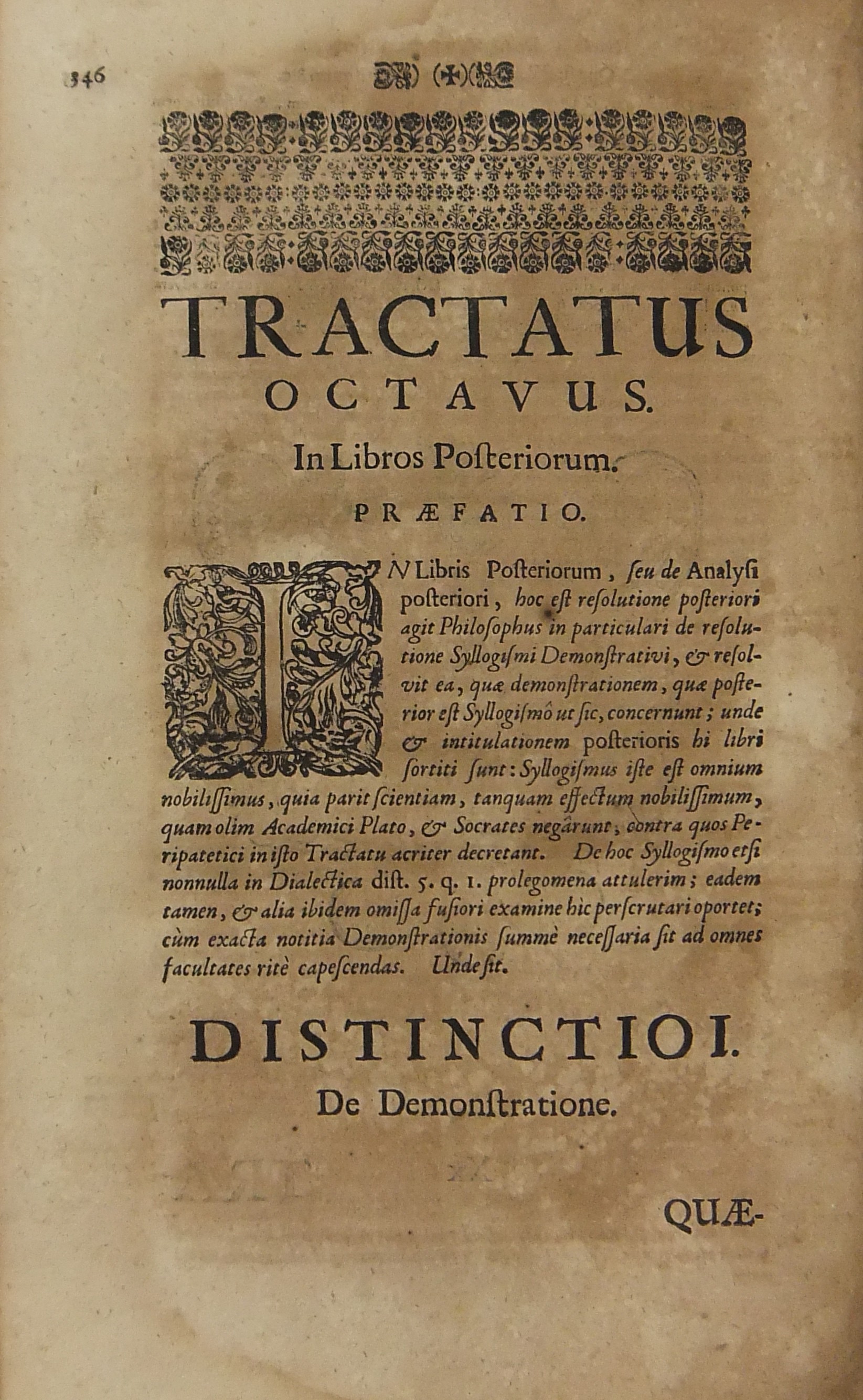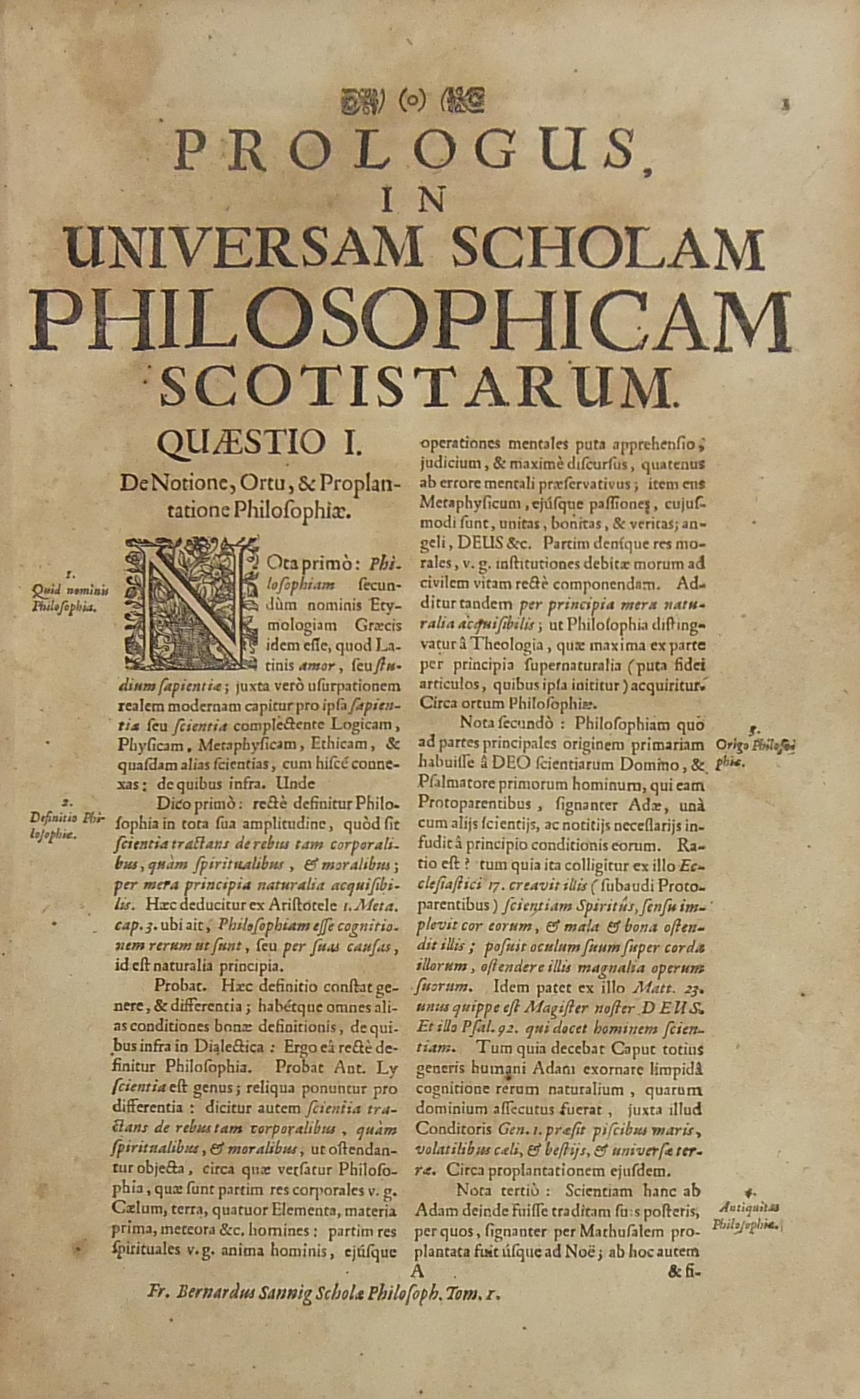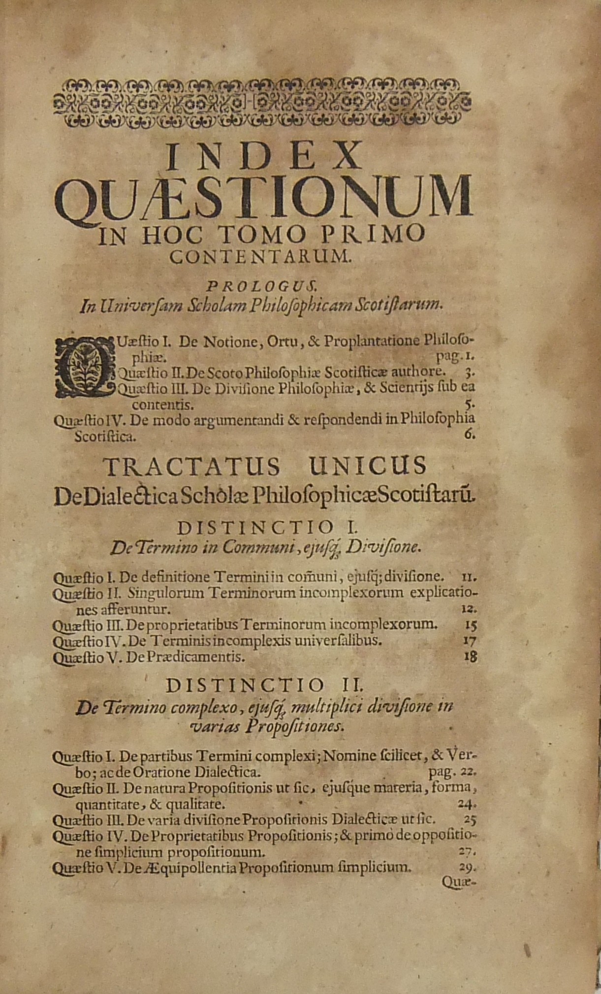 Schola philosophica scotistarum seu cursus philosophicus completus ad mentem Doctoris Subtilis Joannis Duns Scoti.. Tomus I (unico pubblicato) - Continens Prologum in Universam Philosophiam. Dialecticam. Tractatum in Proemialia Logicae. Tractatum de Ente Rationis. Tractatum de Distinctionibus. Tractatum de Universalibus. Tractatum de Praedicamentis. Tractatum in Libros Perihermenias. Tractatum in Libros Priorum. Tractatum in Libros Posteriorum. Tractatum in Libros Topicorum. Tractatum de Ethica