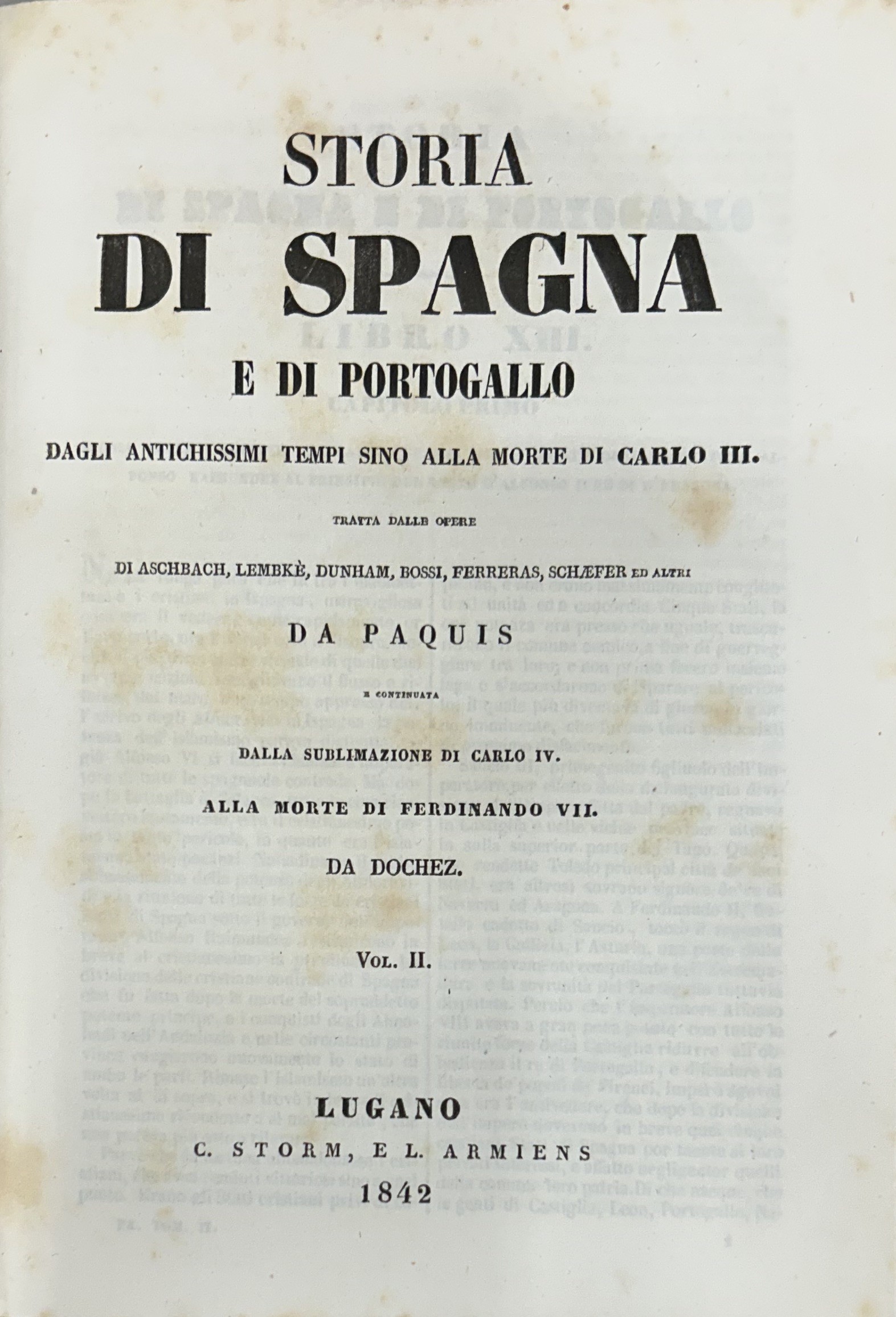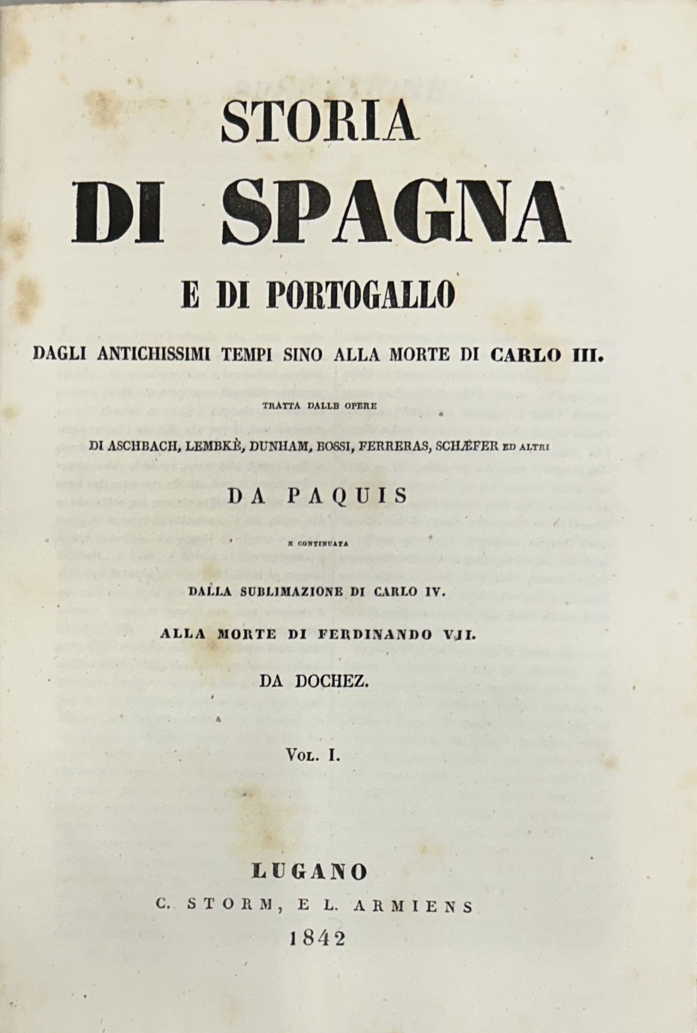 Storia di Spagna e di Portogallo dagli antichissimi tempi sino alla morte di Carlo III. Tratta dalle opere di Aschbach, Lembke, Dunham, Bossi, Ferreras, Schaefer ed altri da Paquis e continuata dalla sublimazione di Carlo IV alla morte di Ferdinando VII da Dochez