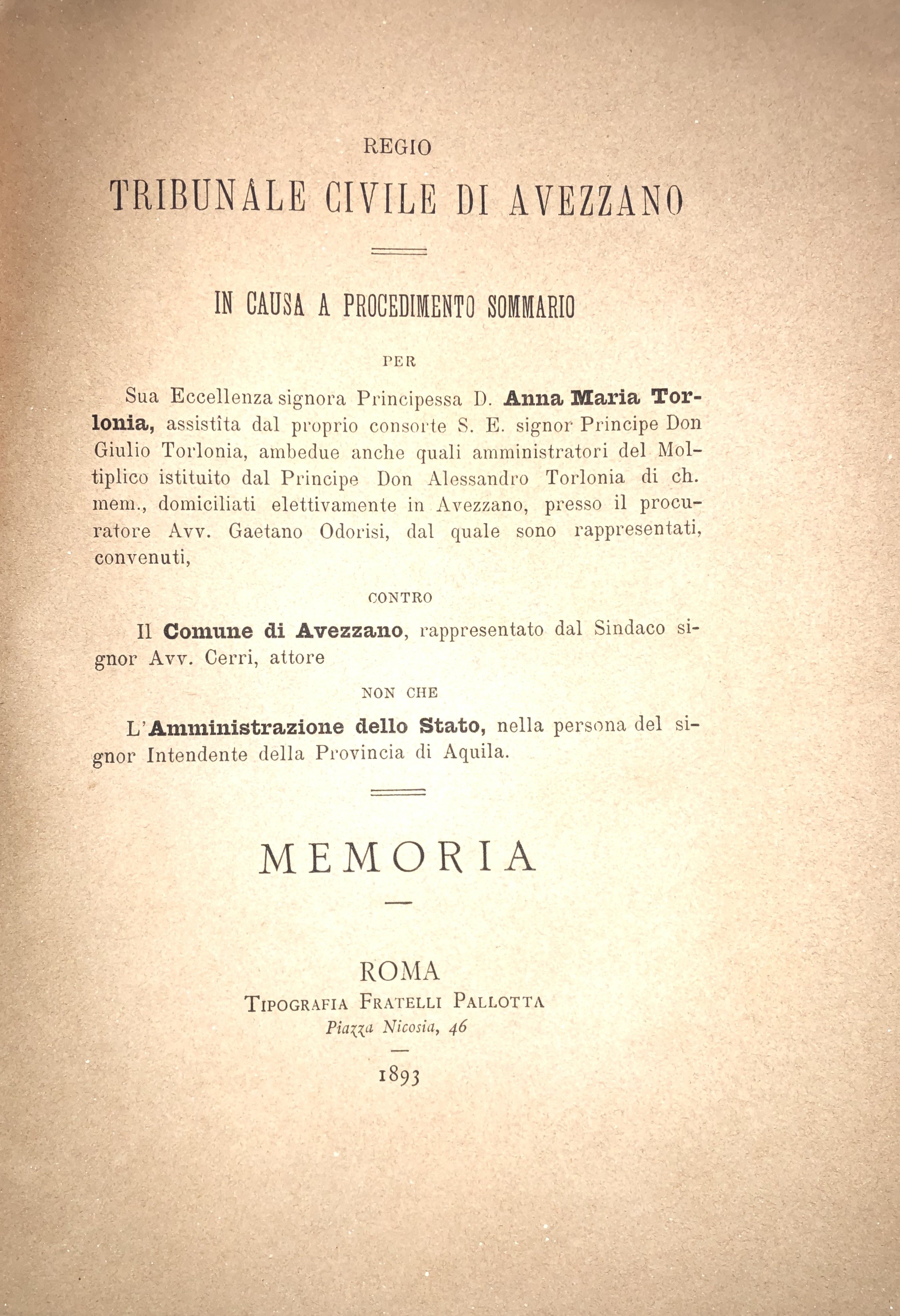 Regio Tribunale civile di Avezzano in causa a procedimento sommario. Memoria. Anna Maria Torlonia; Principe Don Giulio Torlonia; Principe Don Alessandro Torlonia