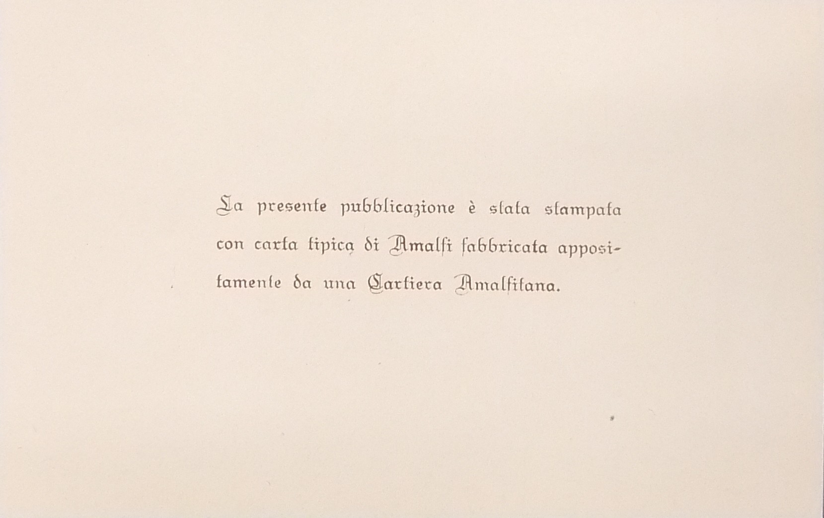 Pubblicazione a cura dell'Ente Provinciale per il Turismo di Salerno stampata su carta tipica di Amalfi. Edizione speciale fuori commercio per la Camera Commercio Industria Artigianato e Agricoltura di Salerno.