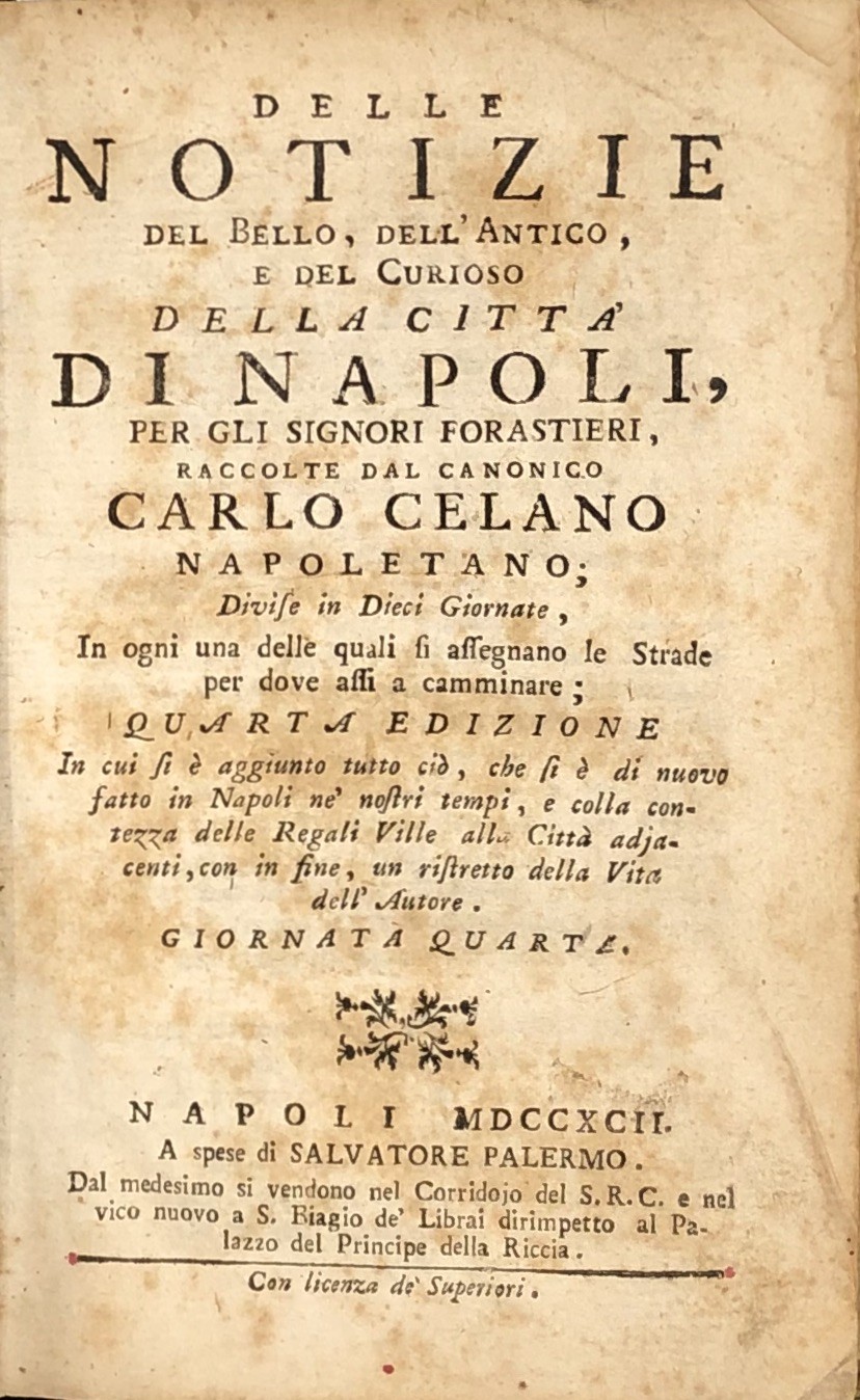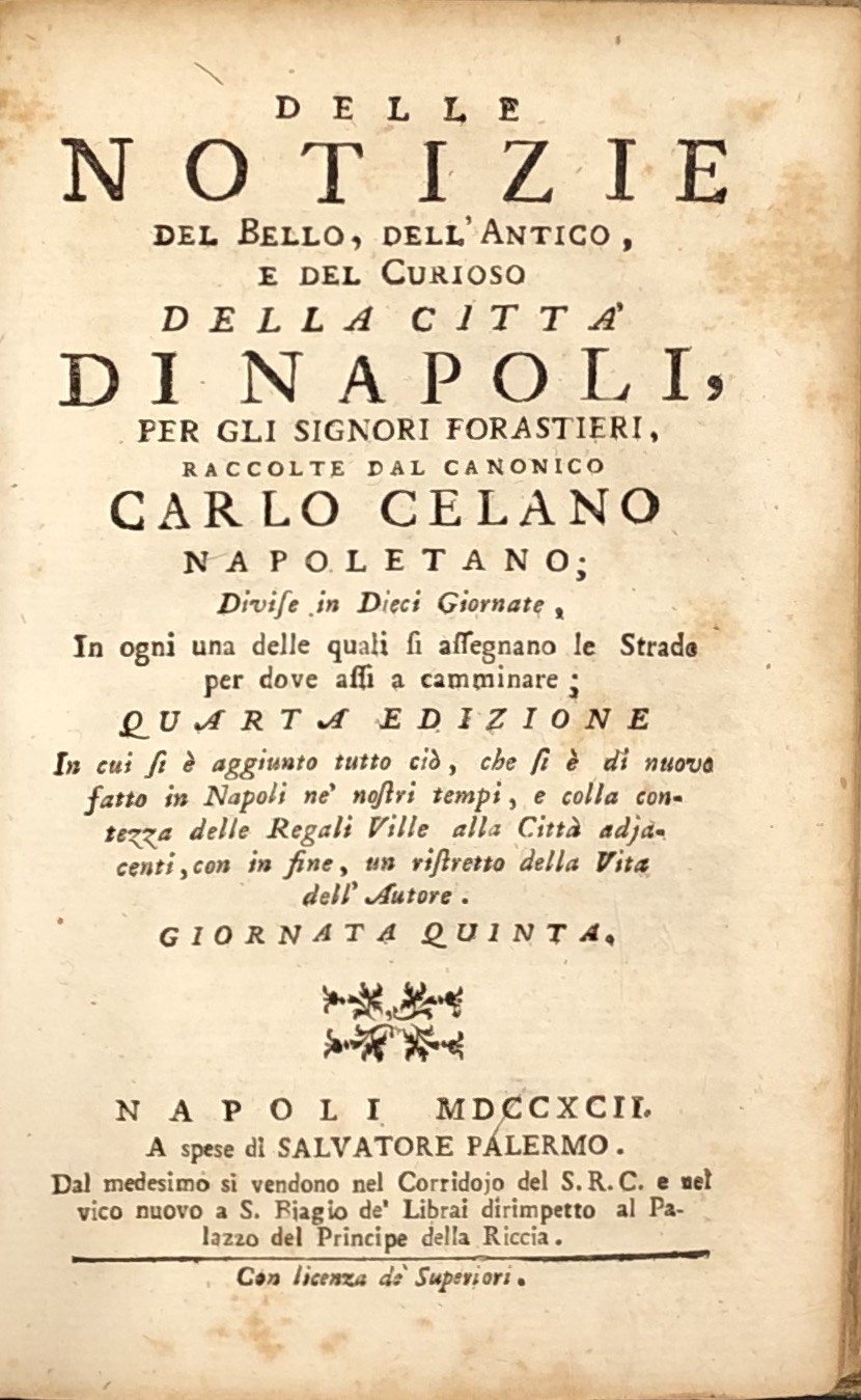 Delle notizie del bello, dell'antico, e del curioso della città di Napoli, per gli signori forastieri... divise in dieci giornate in ogni una delle quali si assegnano le strade per dove assi a camminare. Giornata quarta; Giornata quinta