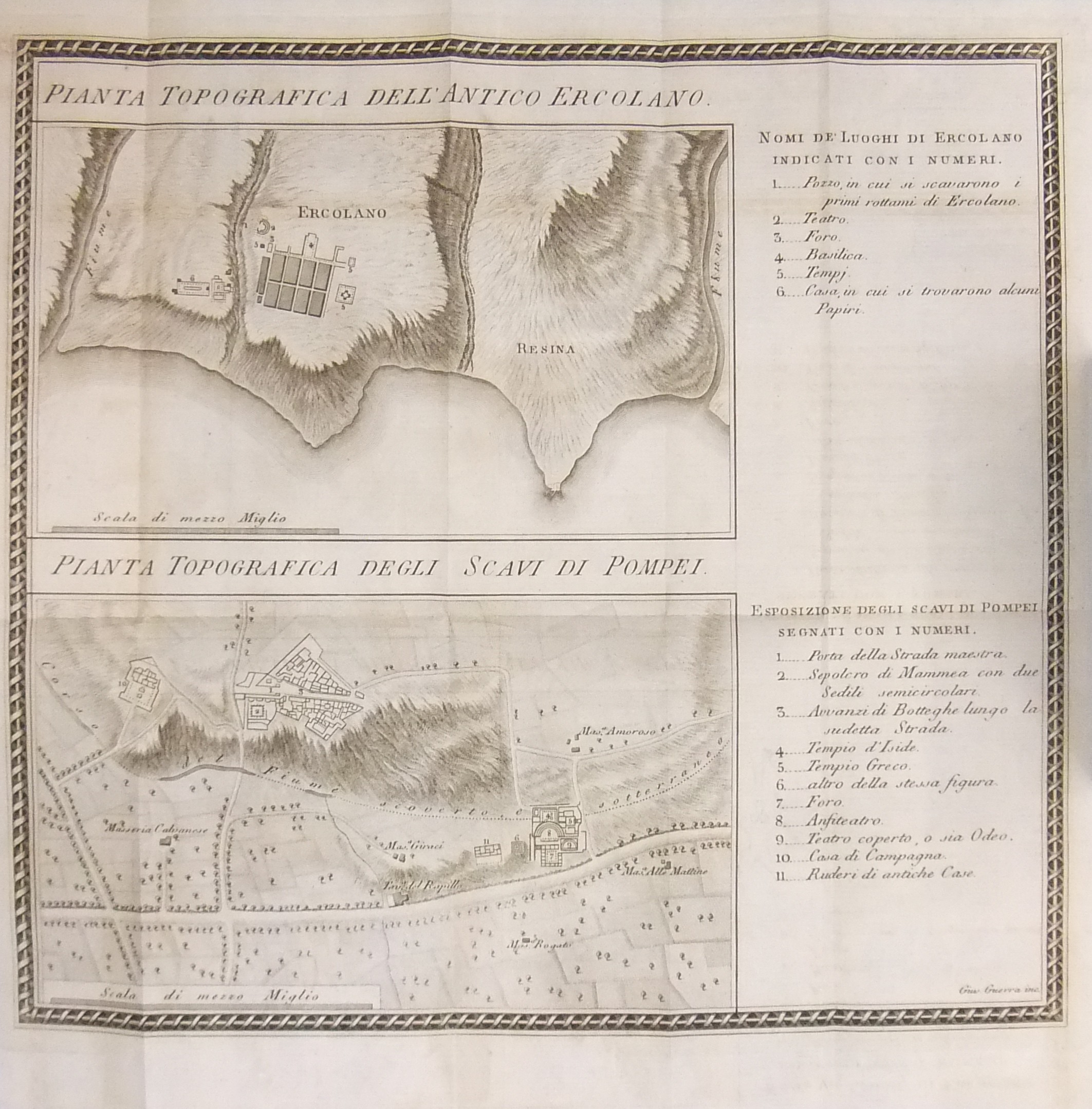 Rara e pregiata edizione completa di due carte topografiche: Pianta topografica dell'antica Ercolano e pianta topografica degli Scavi di Pompei; Pianta topografica del Cratere di Napoli e de' Campi Flegrei