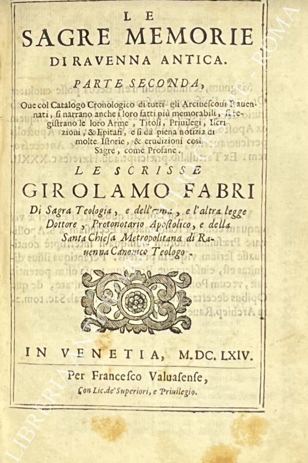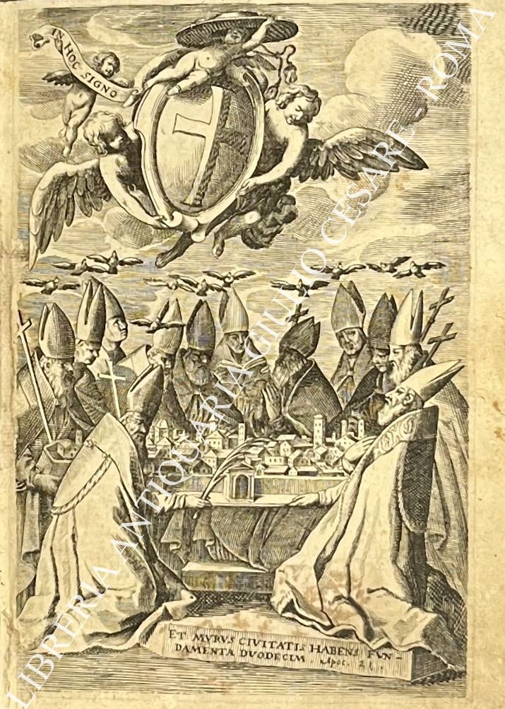 Pregevole antiporta incisa in rame raffigurante stemma e veduta di Ravenna a inizio opera, testatine, capilettera e numerosi stemmi cardinalizi xilografati