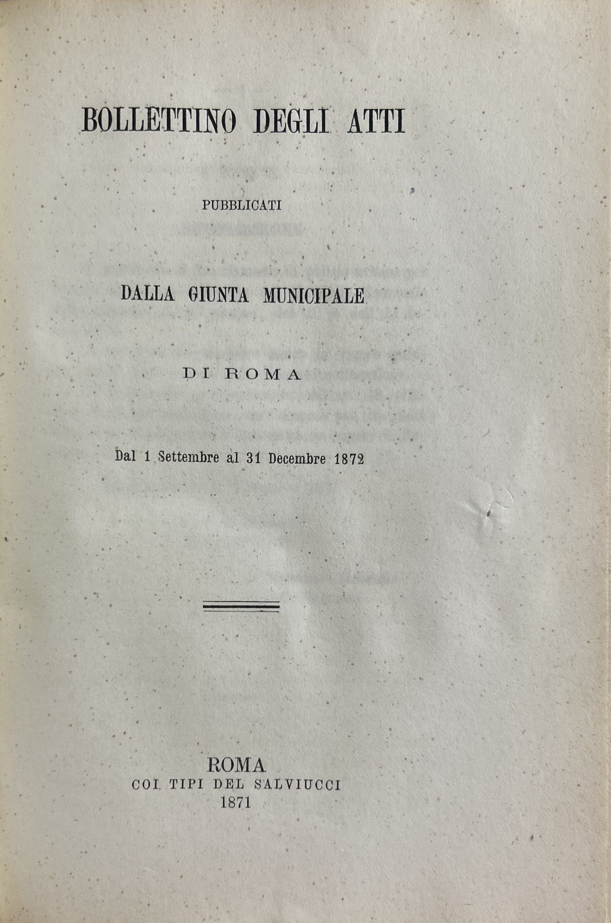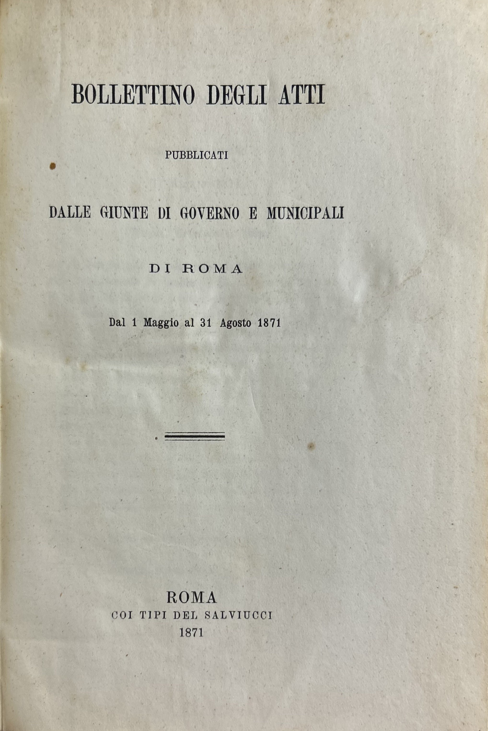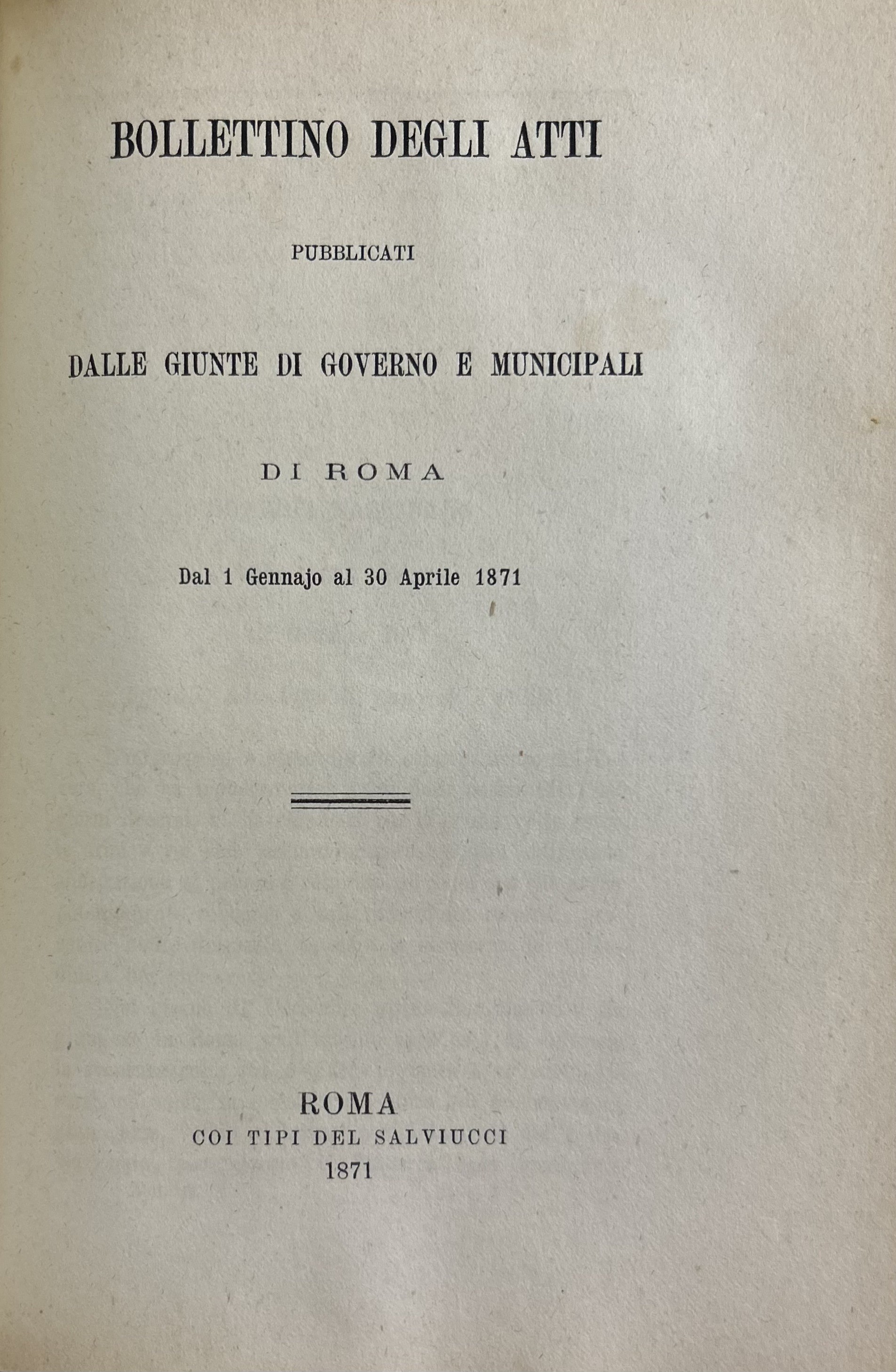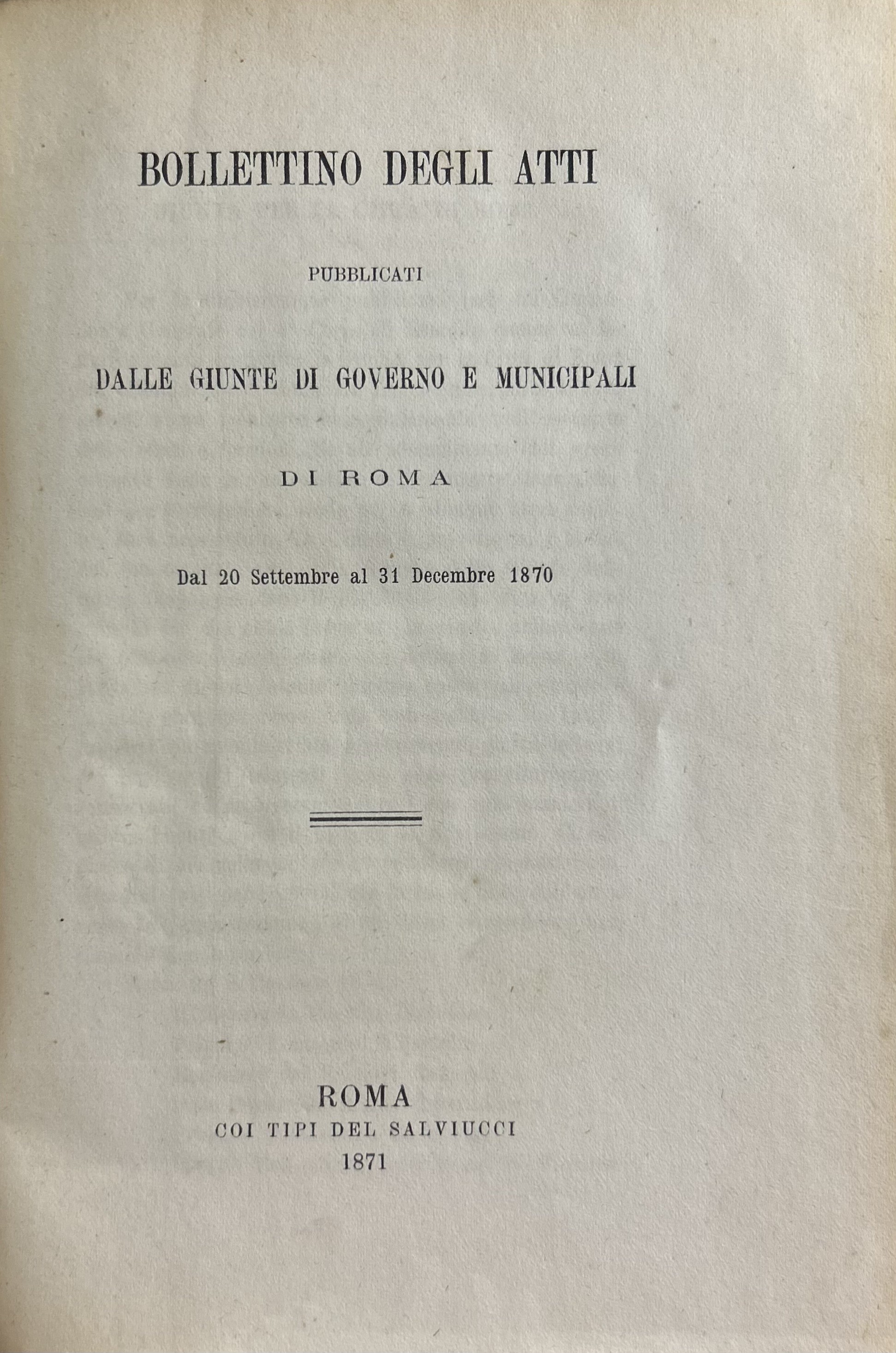 Bollettino degli atti pubblicati dalle Giunte di Governo e Municipali di Roma. Vol. I - Dal 20 settembre al 31 dicembre 1870; Vol. II - Dal 1 gennajo al 30 aprile 1871; Vol. III - Dal 1 maggio al 31 agosto 1871; Vol. IV - Dal 1 settembre al 31 dicembre 1872